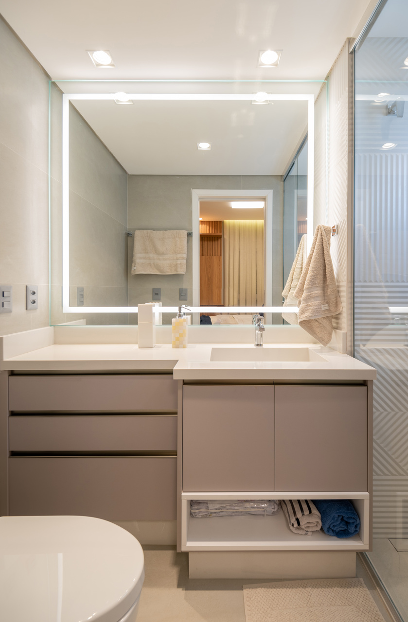 O banheiro de hóspedes foi concebido dentro da paleta cinza, presente no porcelanato e na marcenaria. Nas paredes do box, o revestimento com padronagem geométrica traz identidade para o projeto. Os equipamentos de aquecimento para chuveiros são da Netgás.