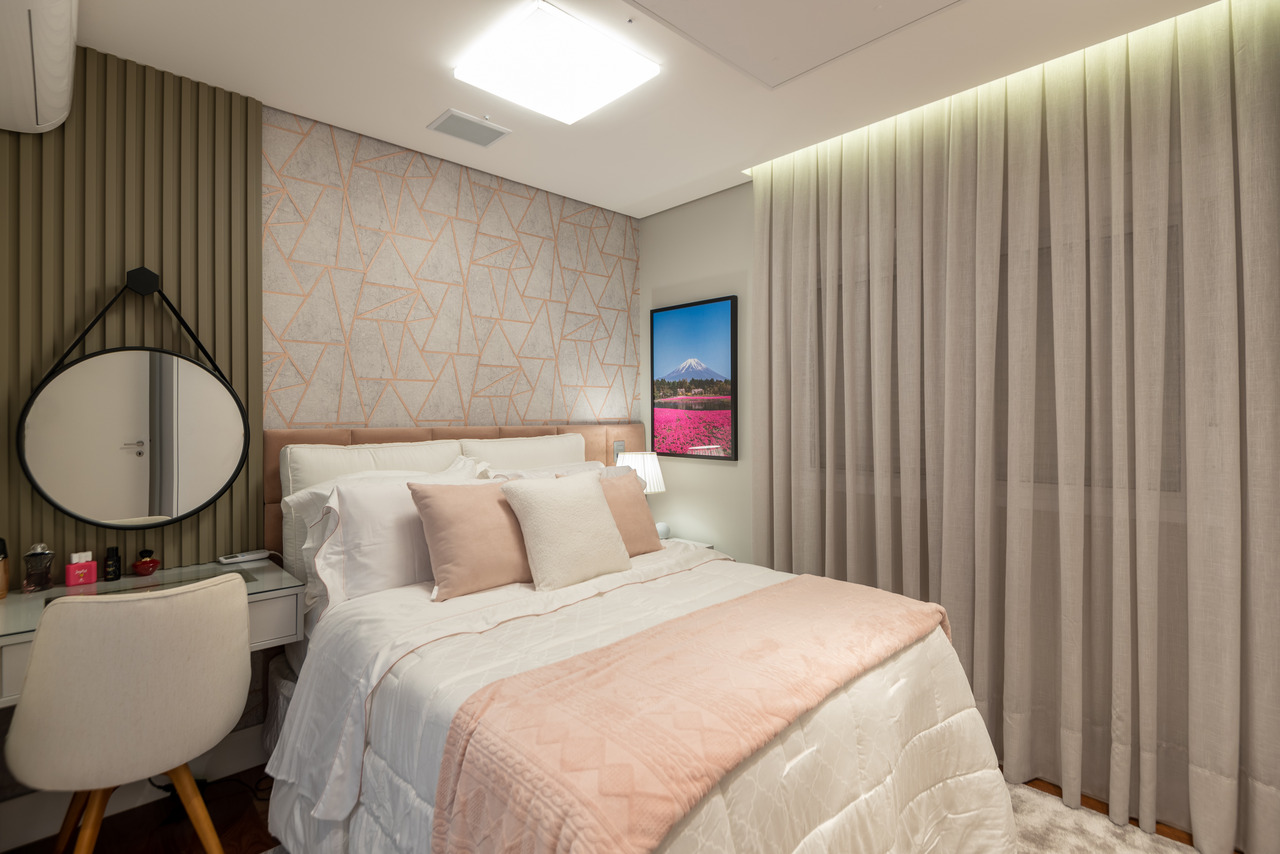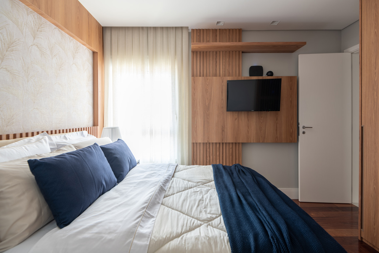 Nas suítes o conforto foi priorizado. Tons de destaque foram escolhidos para o enxoval como o azul marinho e o rosa claro. Soluções na marcenaria foram adotadas para valorizar a décor.