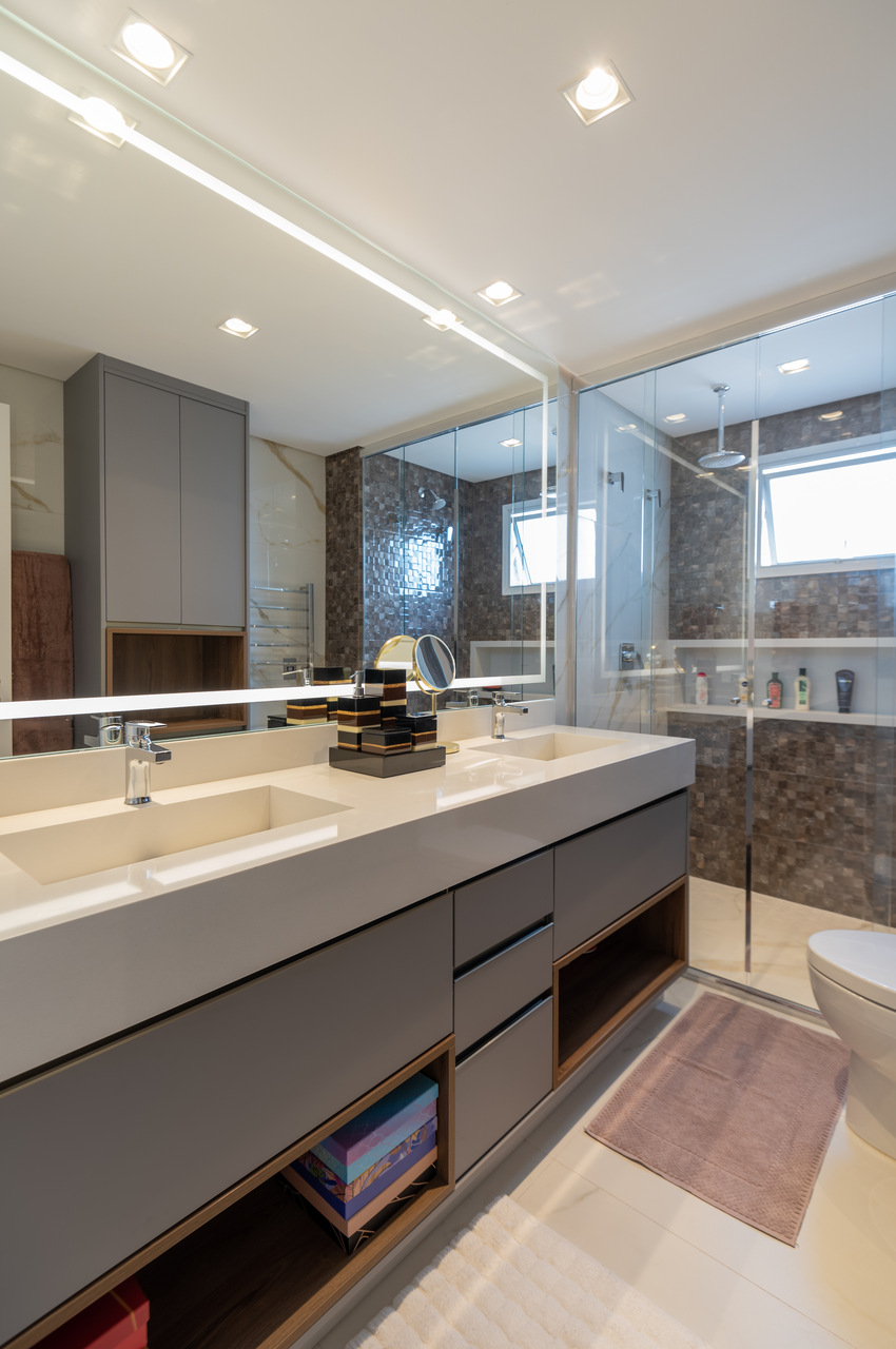 Já no banheiro do casal as formas retas predominam com elegância, através da pia esculpida em quartzo branco pela Internacional Mármores, em meio aos tons escuros escolhidos para o revestimento de uma das paredes do box e nos nichos da marcenaria.