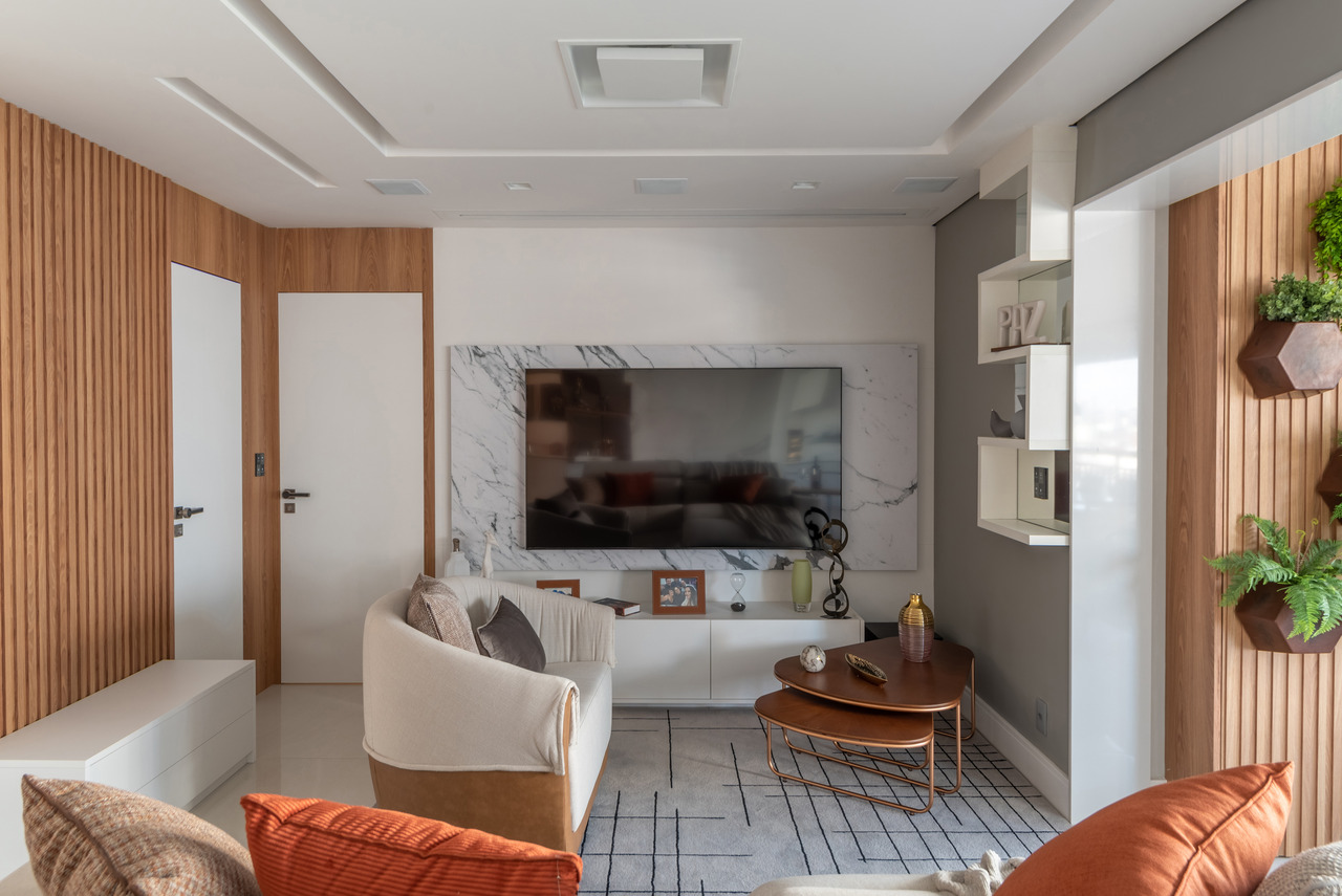 Logo na entrada do apartamento de 176 m², a luz natural invade os ambientes e traz a sensação de fluidez e amplitude, com a integração da área gourmet com o social. Paredes foram revestidas em madeira e em algumas partes com painéis ripados no living, para trazer a sensação de conforto e sofisticação, com revestimento no padrão Calacatta aplicado no painel da TV e também em uma lareira entre as salas.