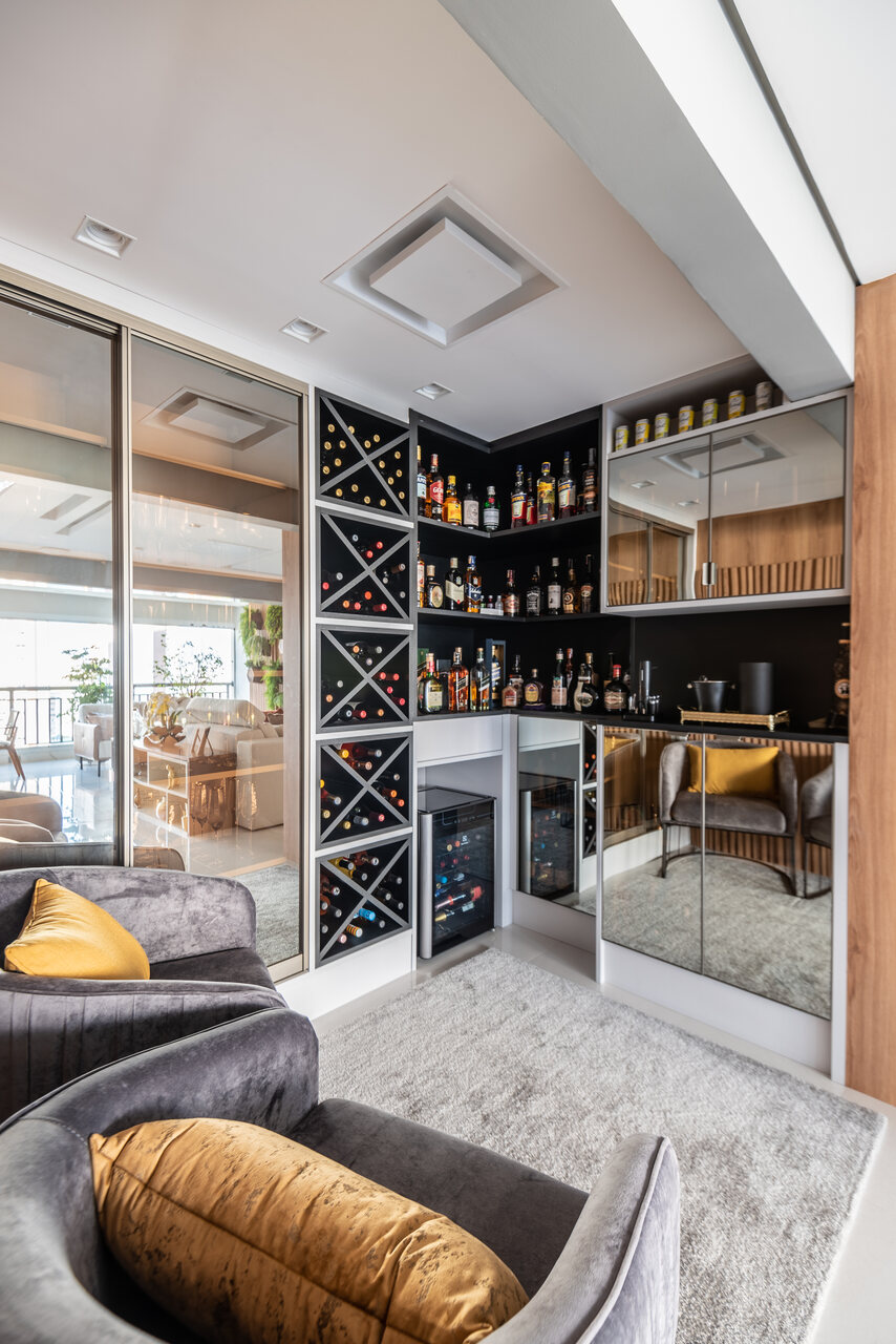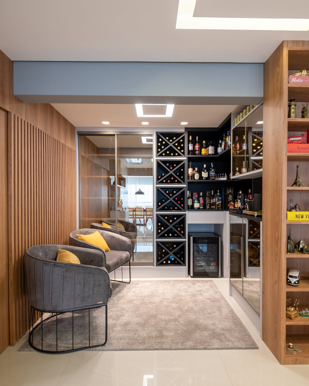 A adega era um dos principais desejos do cliente. Para a marcenaria, criada pela Bontempo, foram escolhidos tons mais escuros para deixar o espaço intimista, perfeito para relaxar e degustar vinhos.
