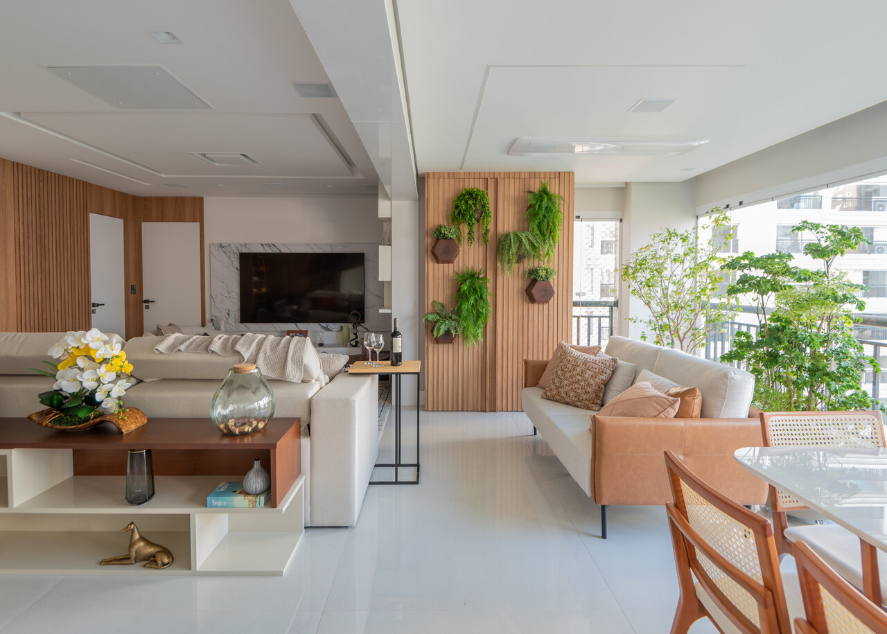 Com mobiliários confortáveis e de linhas retas, a disposição dos mesmos permite uma melhor circulação na área social. Destaque para a vegetação presente na varanda gourmet, com jardim vertical e árvores de pequeno porte, incluindo uma jabuticabeira.