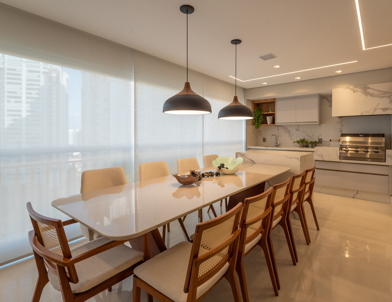 A área gourmet segue na paleta clara, com bancada executada pela Internacional Mármores com o mesmo revestimento utilizado na lareira do living. A mesa comporta muitos lugares, perfeita para receber. A madeira e a palha que compõem as cadeiras aquecem o ambiente. A churrasqueira, coifa e toda infraestrutura de gás foi feita pela Netgás.