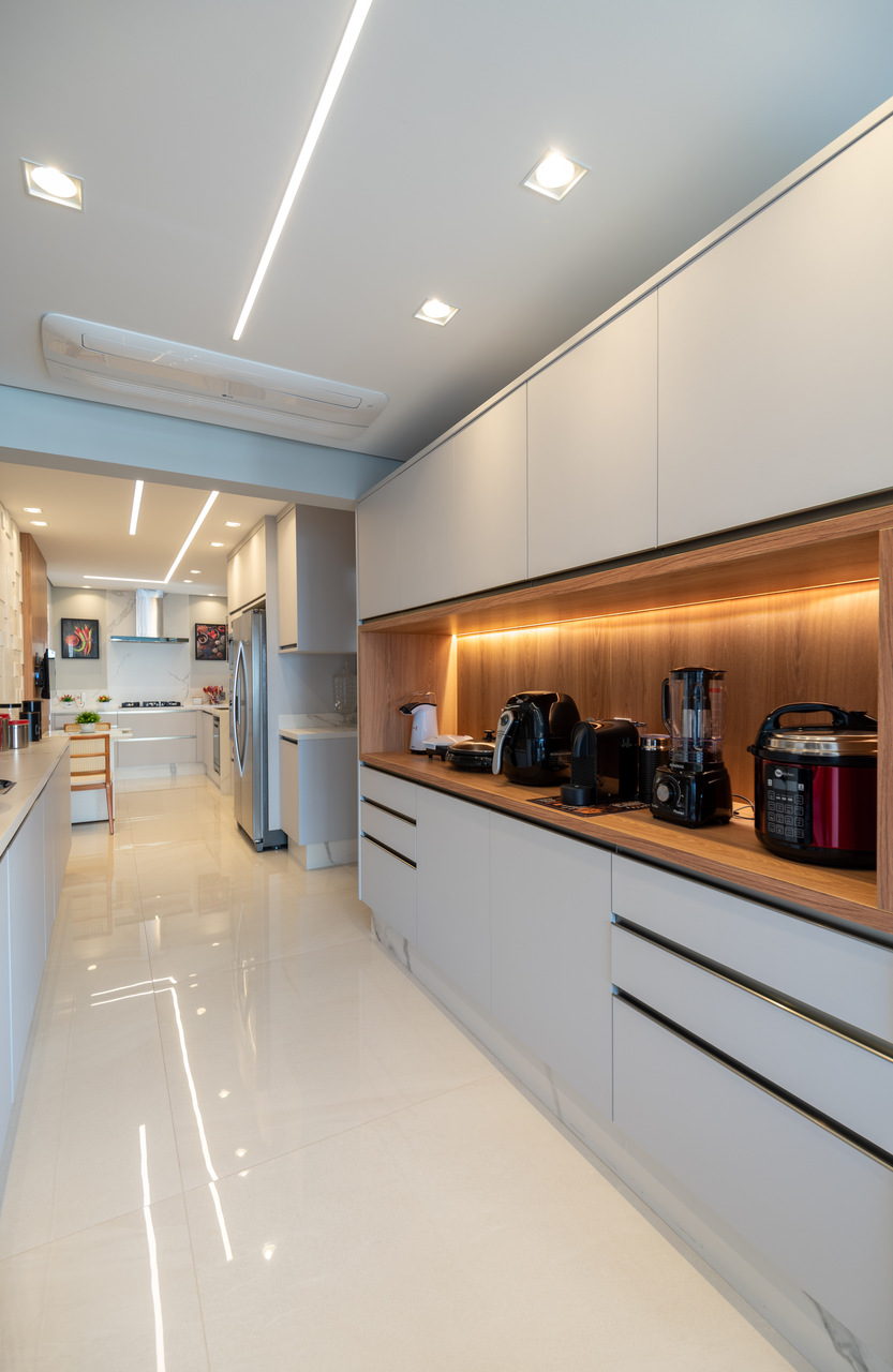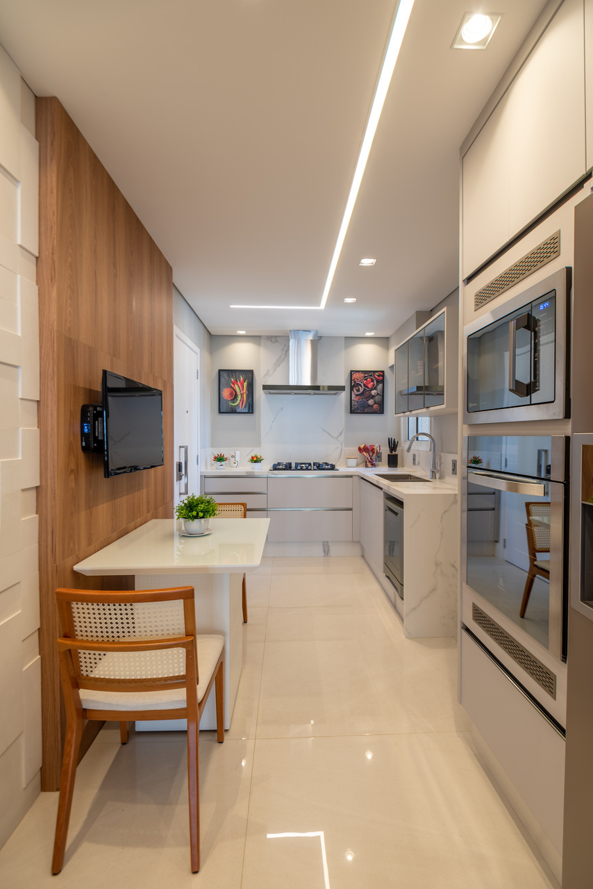 Soluções funcionais foram escolhidas para a marcenaria da Bontempo criada para a cozinha, isolada da área social. A escolha de acabamentos criam harmonia em toda a unidade, que também tem a presença da madeira clara em painéis e nichos para os eletrodomésticos.