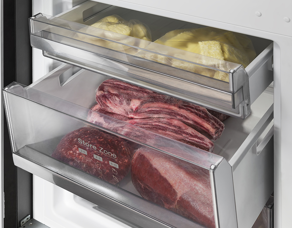 No Freezer gavetas diversas têm funções diferentes. São três gavetas para armazenar variados tipos de alimentos, oferecendo muito mais que congelamento, organização e praticidade. A gaveta superior é ideal para guardar alimentos menores; a store zone tem capacidade de 38L, ideal para armazenar carnes e aves inteiras. E a gaveta inferior para alimentos embalados.