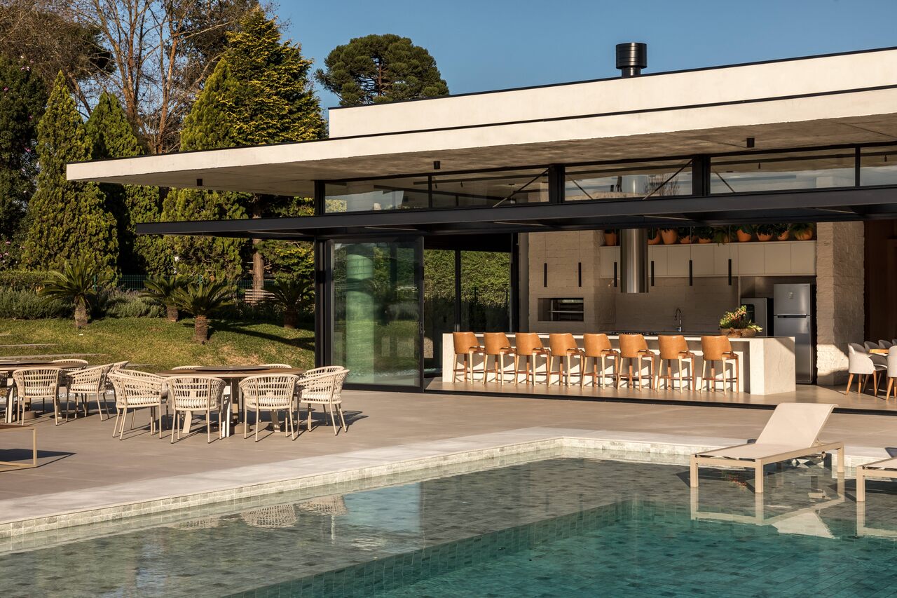 O projeto de interiores desta área de lazer em Piraquara, na região metropolitana de Curitiba, assinado pelas arquitetas Camila Trombini e Luiza Monclaro, do ARQ+CO Studio, transforma o cenário de um haras em um refúgio contemporâneo e cheio de personalidade. Com 559m², o espaço foi concebido como complemento à casa principal dos proprietários, já existente no local e projetada pelo arquiteto Ricardo Amaral, que também assina o projeto arquitetônico do novo espaço. O ambiente, com intuito de ser palco para momentos especiais entre amigos e familiares, nasce com uma proposta de conforto e versatilidade.