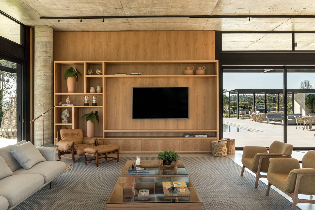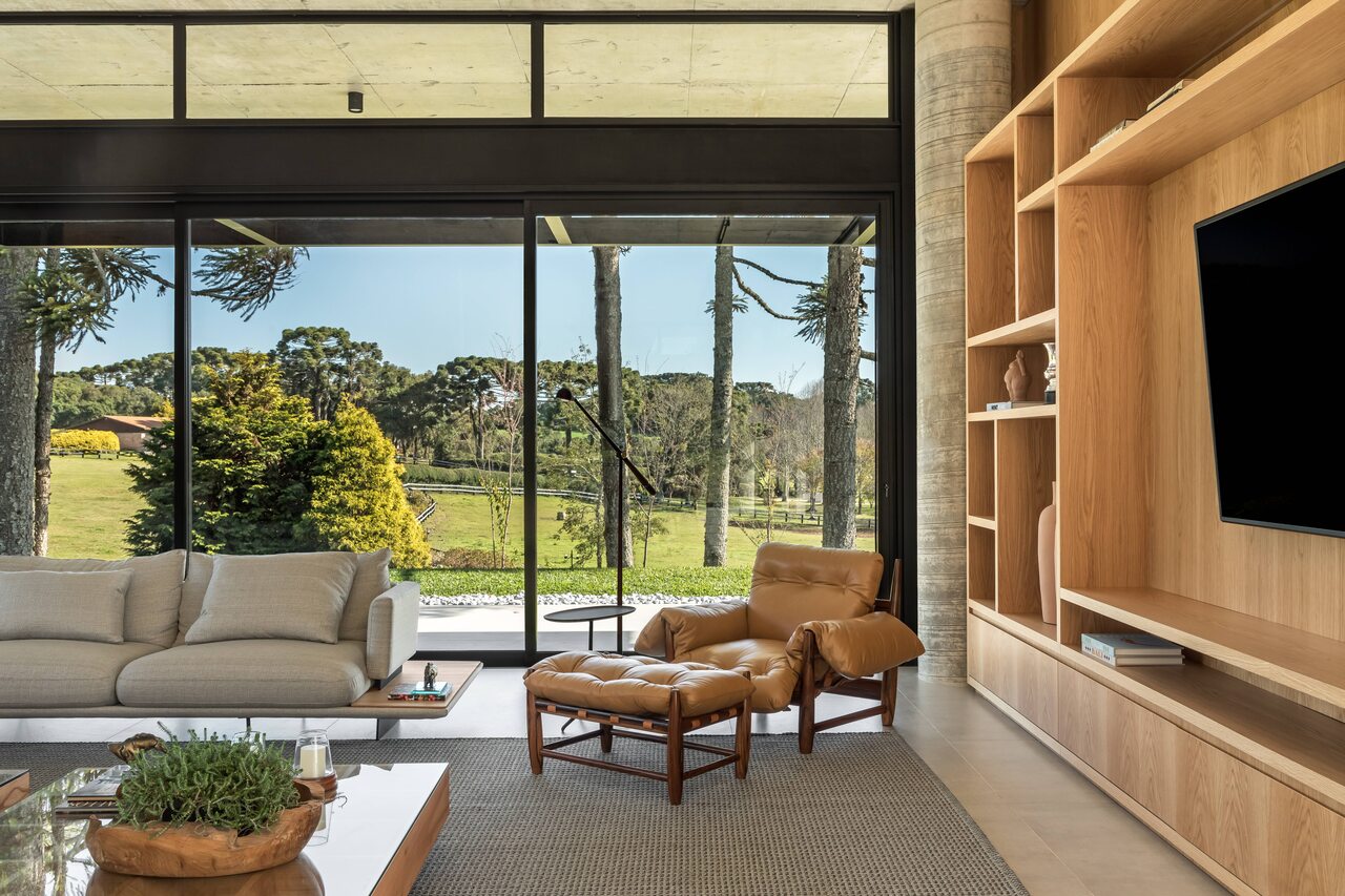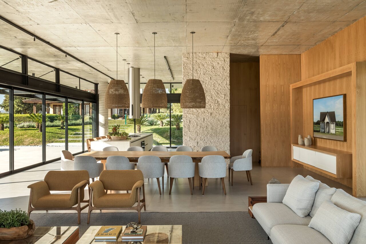 Assinado por Leticia Mello, o paisagismo também teve papel fundamental no projeto. A profissional fez uma leitura sensível das necessidades dos clientes e, com intervenções pontuais, valorizou os melhores enquadramentos do entorno natural do haras. Os móveis externos da loja Pátio Brasil, Mestre Artesão e Lo complementam o cenário, reforçando a atmosfera de descanso e contemplação.