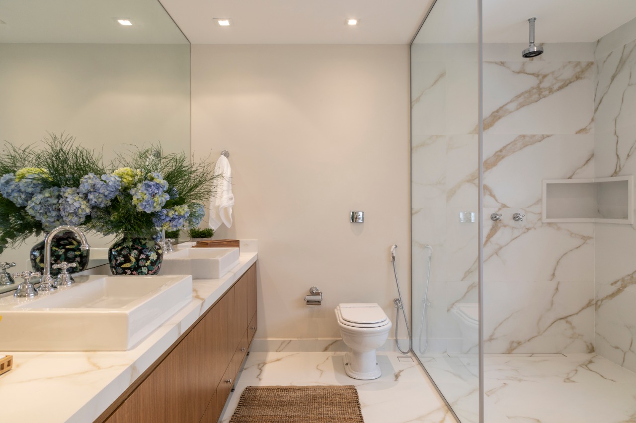 A mistura de texturas nos revestimentos deste banheiro traz o toque de brasilidade.
