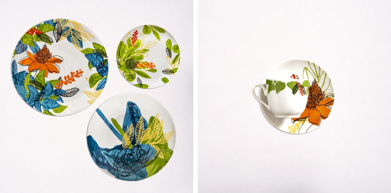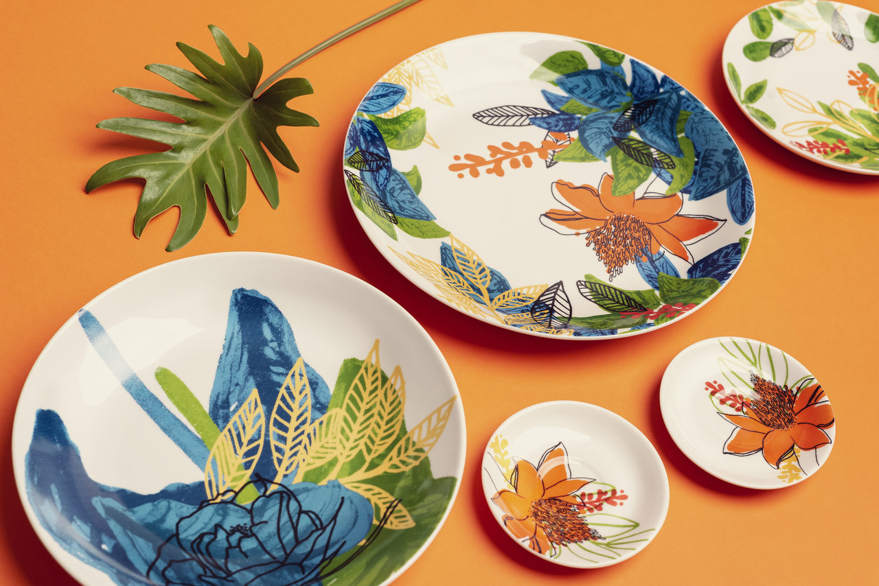 A tropical e vibrante linha exclusiva de porcelana inspirada na flora do Instituto Inhotim é vendida também por e-commerce
