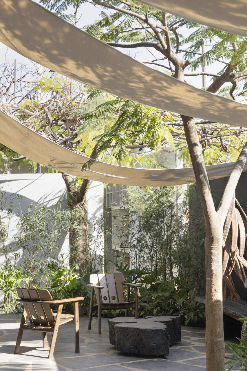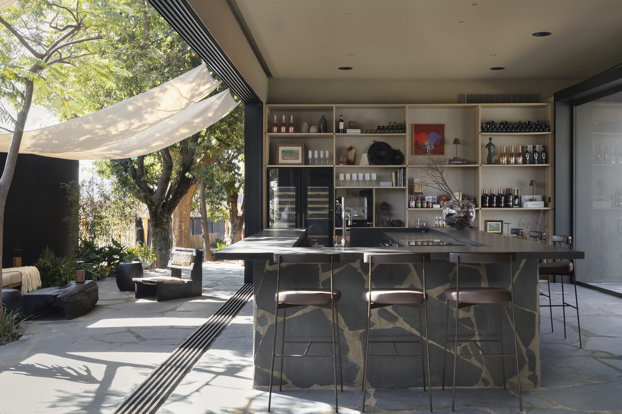Na área externa, um recanto de estar foi meticulosamente contemplado para encontros sociais por meio do emprego da madeira carbonizada. Essa escolha proporcionou um resultado visualmente impactante e perfeitamente integrado ao projeto, que foi constituído por mobiliários desenhados pelas arquitetas, assim como a curadoria do design brasileiro assinado por nomes de âmbito internacional, como Paulo Alves e Sérgio Rodrigues – escolhas que adicionam excepcionalidade e requinte à parte externa do bar.