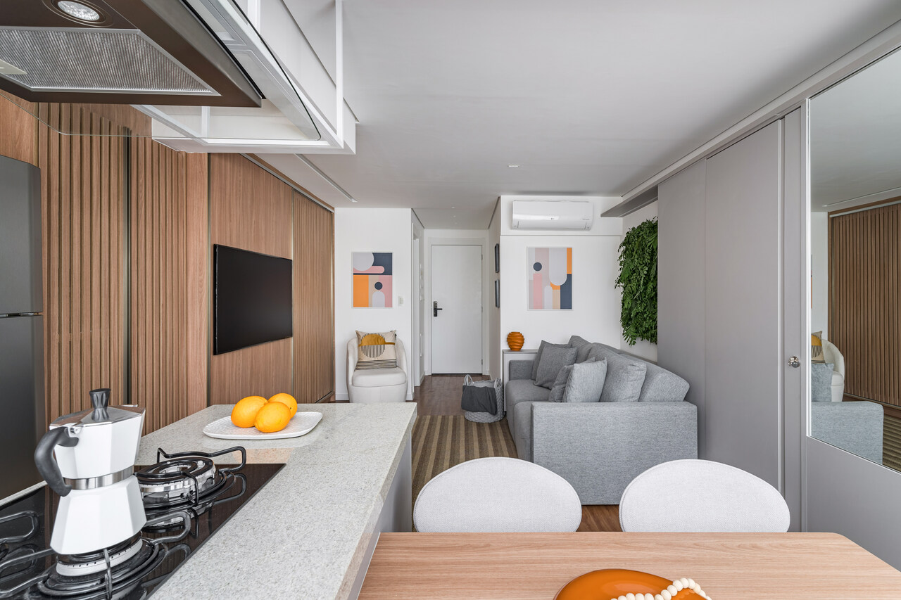 Com 45m² e marcenaria como aliada, o projeto surpreende ao esconder a lavanderia na sala, criar uma ilha gourmet e otimizar ao máximo o espaço disponível