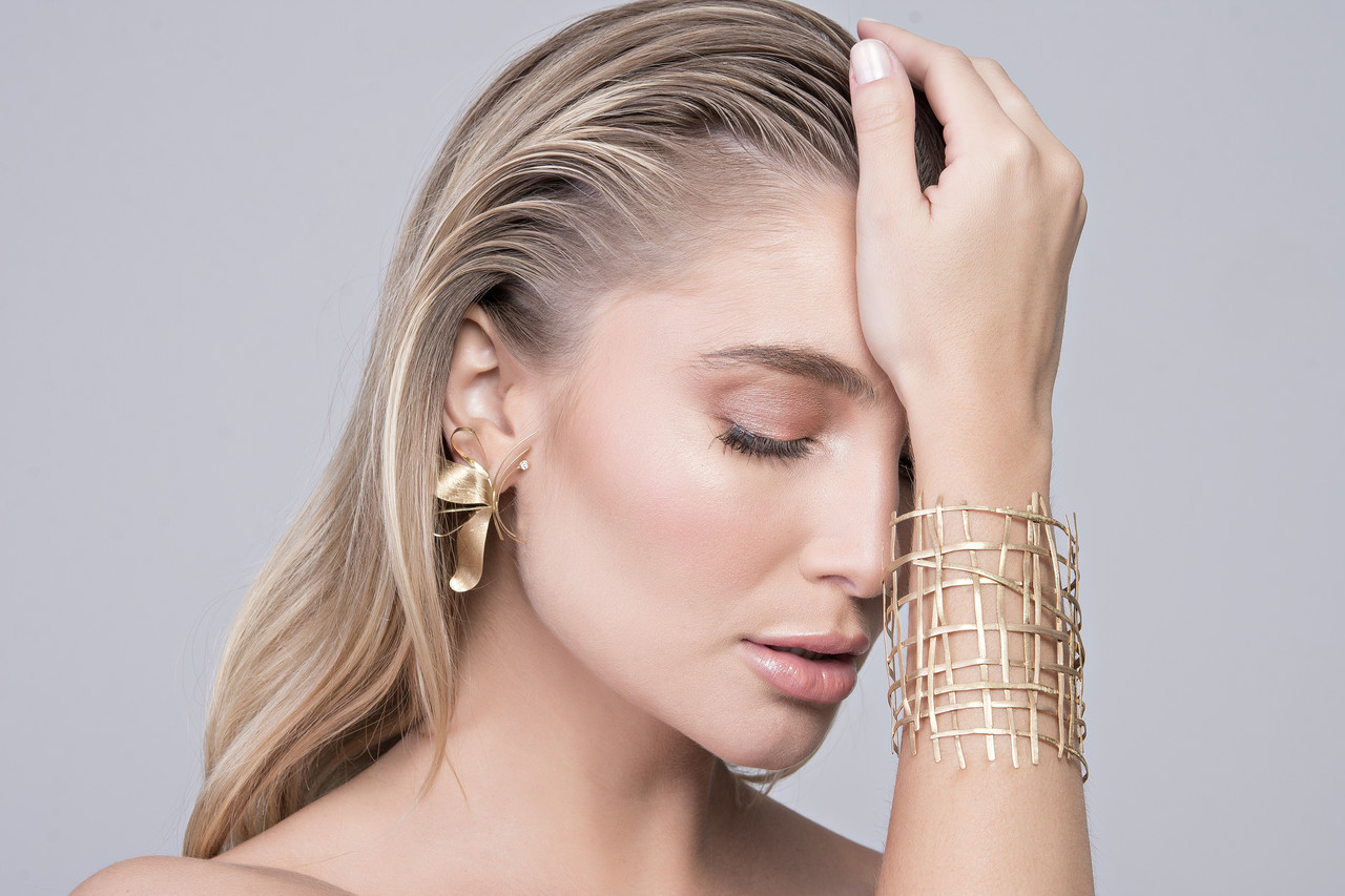 Na foto de capa: Melissa Maia se inspirou nas palhas dos artesãos para criar a Pulseira Telada, em ouro amarelo. O brinco, também em ouro amarelo, possui diamantes e traz a leveza e exuberância da Borboleta.