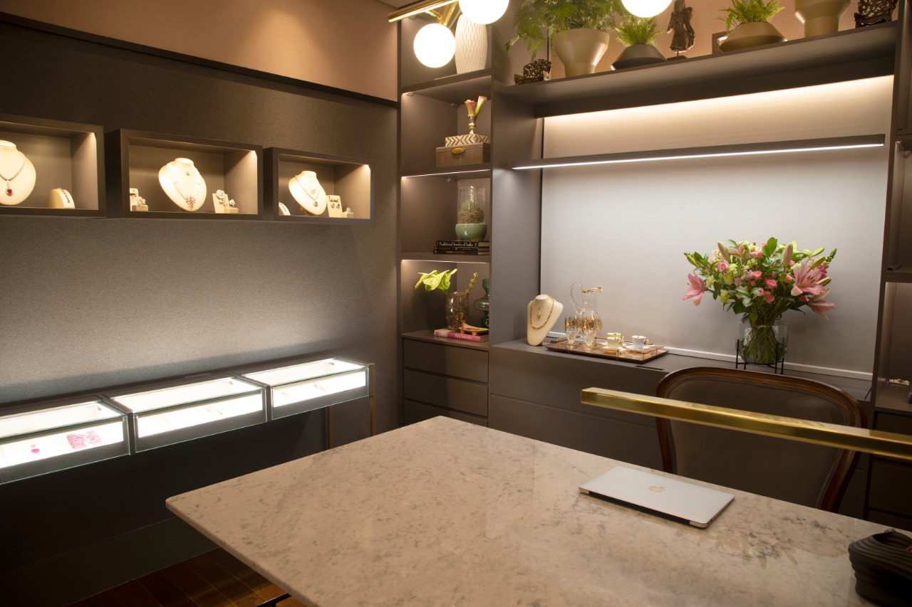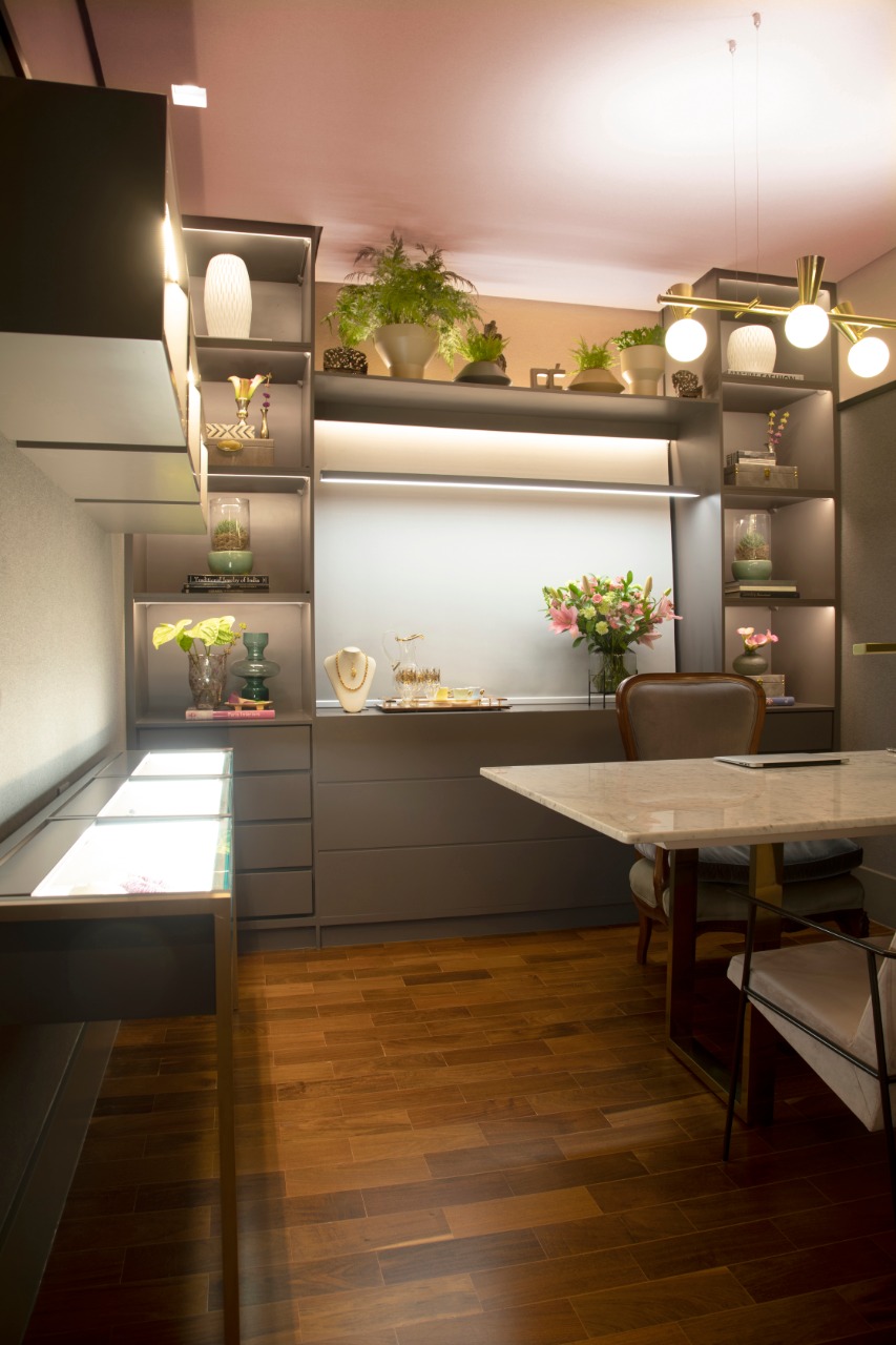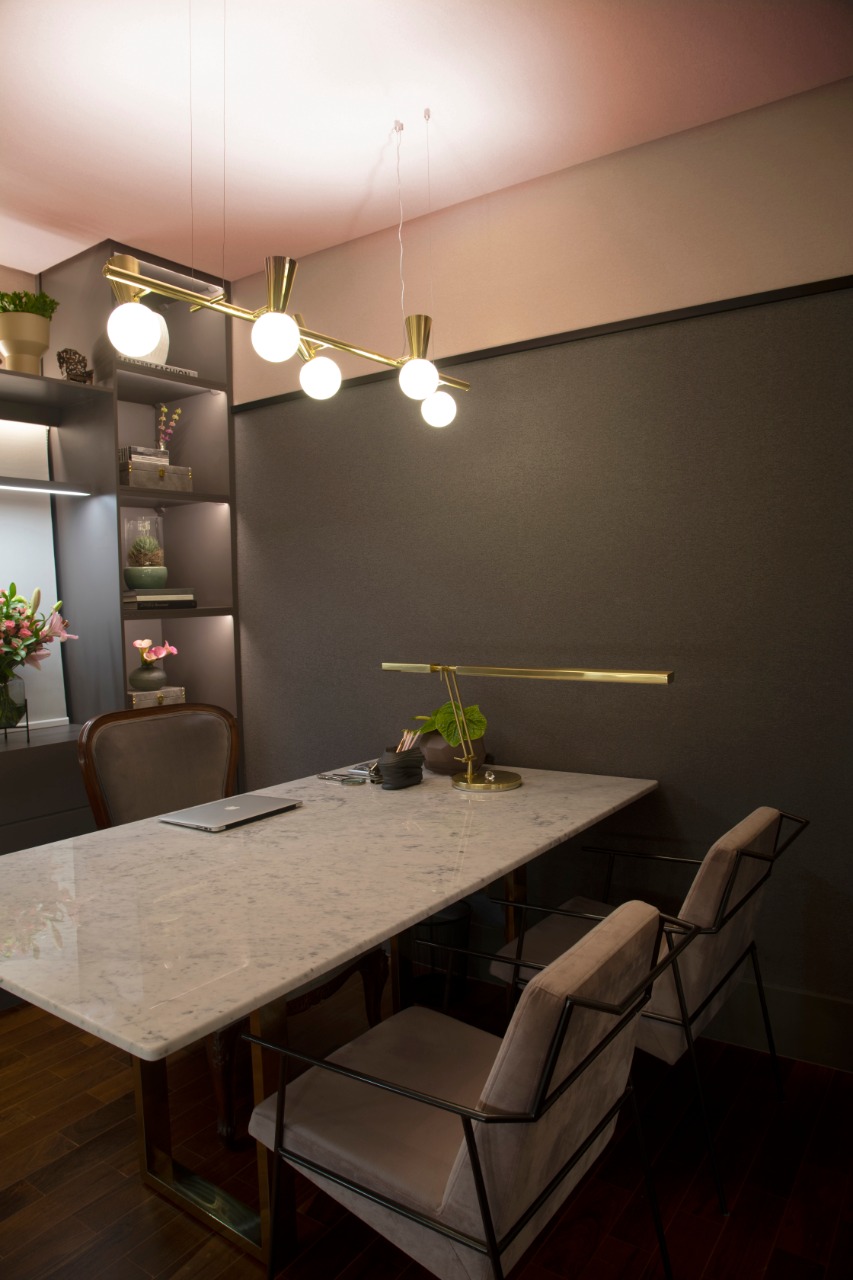 O ambiente que era anteriormente uma sala de almoço, foi reorganizado para um home office inspirado nos pequenos e antigos ateliês parisienses. A sobriedade é uma das principais características, onde a cor grafite foi a base para a marcenaria e paredes. A cor rosa traz feminilidade e entra no papel de parede em linho rústico, que recobre todo o teto. A cor dourada, que remete ao trabalho em joias exposto neste office, marca presença na base da mesa com tampo em mármore Carrara e nas luminárias, desenhadas e desenvolvidas pelo escritório.