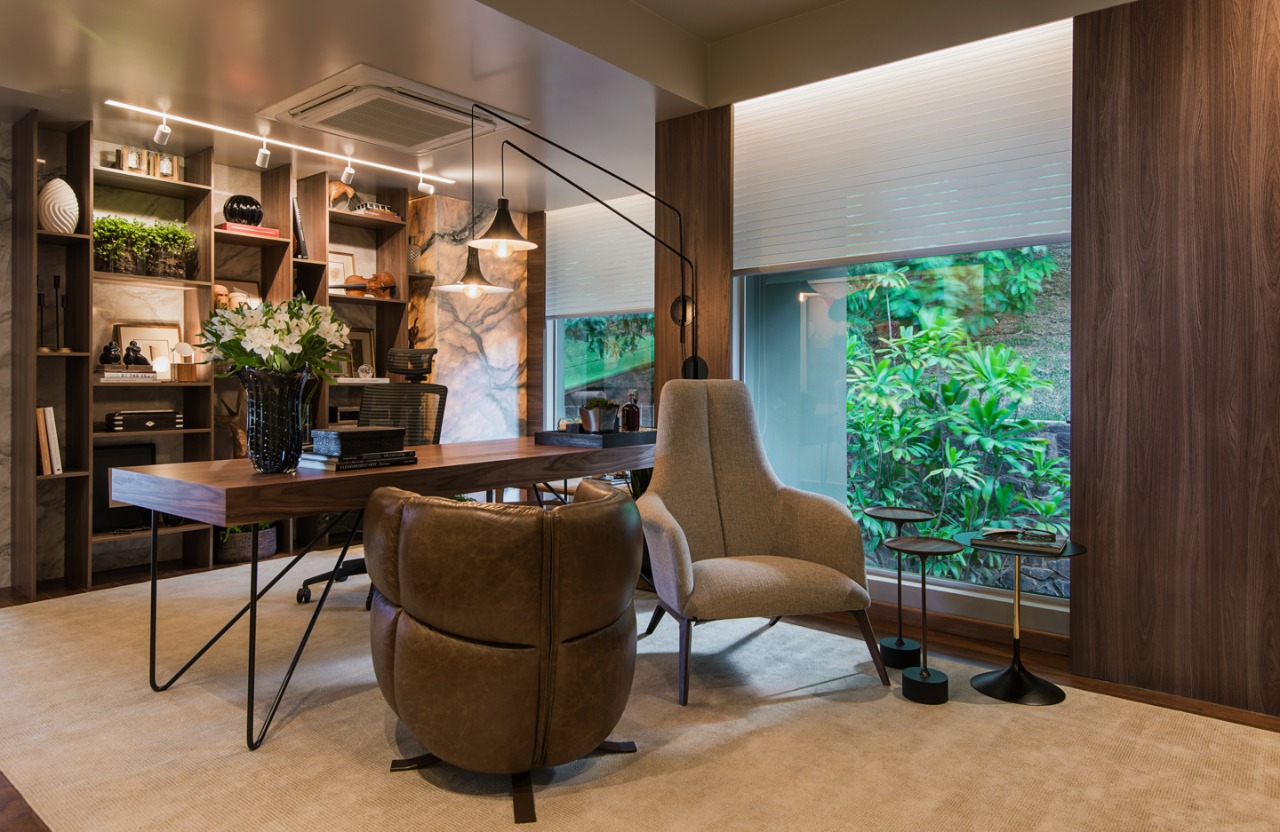 Com uma cartela de cores naturais e materiais nobres, o ambiente é organizado para levar aconchego e iluminação natural no Home Office Amendoeira. O espaço é iluminado e protegido através do vidro Habitat Neutro incolor, também da Cebrace Vidros, que integra os ambientes e possibilita o contato com a natureza. Painéis de madeira revestem algumas das paredes, enquanto o destaque fica para o revestimento em pedra na parede da estante que possui os mesmos tons amadeirados da mesa de trabalho.