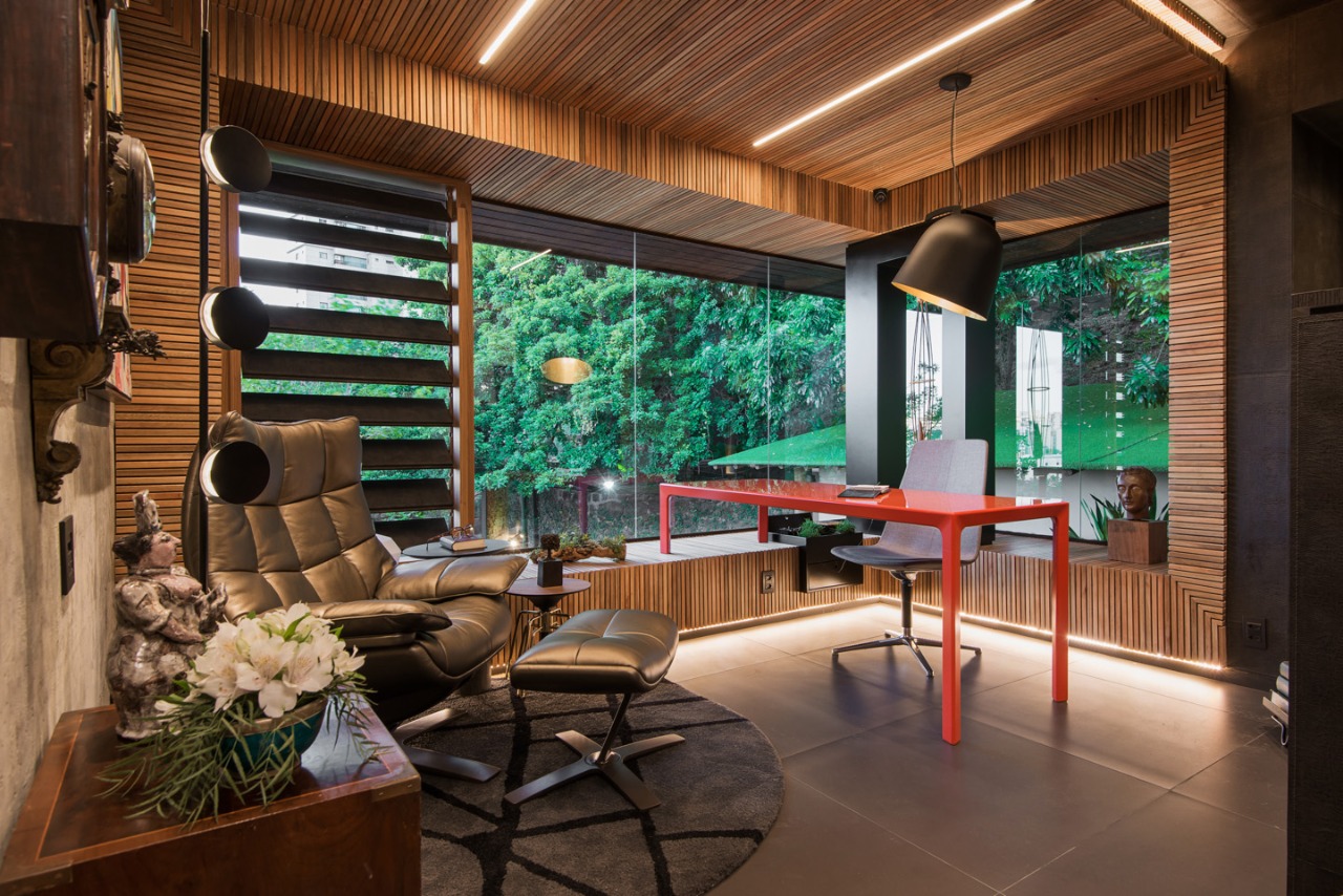 O Home Office Jambeiro reforça a importância da iluminação natural para o ambiente de trabalho. Para aproveitar ao máximo a incidência de luz solar, a arquiteta utilizou o vidro Habitat Neutro incolor da Cebrace Vidros em dois grandes vãos de abertura, os quais integram a paisagem externa para o interior da sala. O painel ripado domina duas paredes do ambiente trazendo o clima de conforto, onde os tons de cinza e amadeirados se complementam. O destaque fica para a mesa em cor laranja que sobressai do painel abaixo da janela. Uma poltrona em couro transforma o espaço também em um local de leitura.