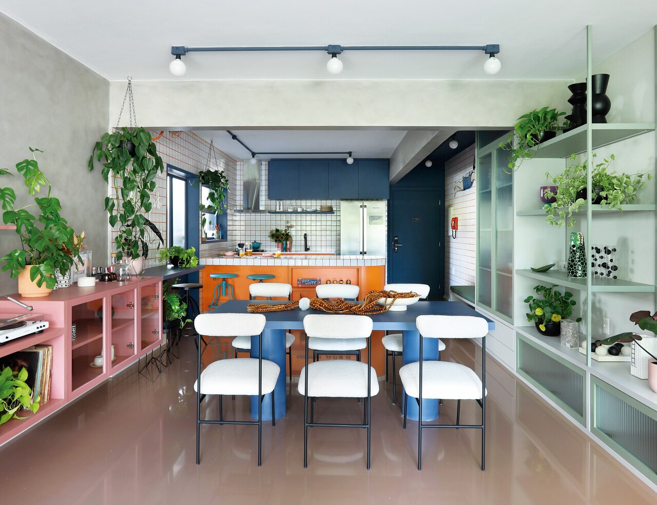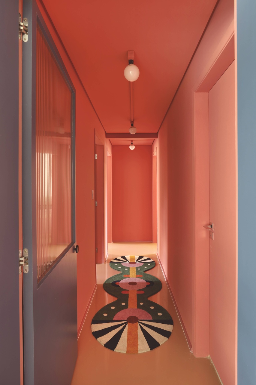 Ao se depararem com o letreiro luminoso “Boa noite, meu povo, que eu cheguei”, trecho da música “Baianá” de Barbatuques, as arquitetas encontraram inspiração para o conceito do projeto. As paredes brancas foram a base perfeita para introduzir a alegria e o ritmo vibrante da música. Cores foram aplicadas em todos os ambientes. Ao todo, foram utilizadas 30 tonalidades diferentes, selecionadas e harmonizadas para criar uma paleta super colorida que inclui azul, laranja, rosa, cinza, preto, mostarda, branco e verde. Essas cores se fazem presentes em todos os detalhes, desde o mobiliário até o piso, paredes, objetos decorativos e têxteis.