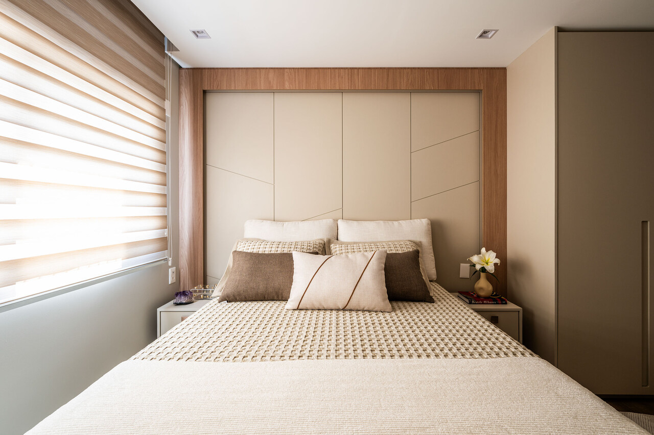 Na suíte master, tons de bege e areia promovem tranquilidade e conforto. A parede da cabeceira recebeu painéis com desenho geométrico e iluminação embutida, criando um cenário acolhedor para o descanso. De frente para a cama, um espaço multifuncional reúne penteadeira e armários planejados, com portas em vidro reflecta bronze que valorizam a coleção de bolsas da moradora. “Cada detalhe foi pensado para tornar o ambiente funcional e, ao mesmo tempo, expressar a personalidade da cliente. É um quarto que convida a desacelerar”, destaca a arquiteta.