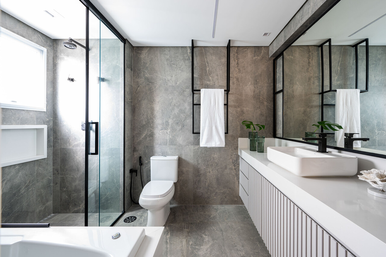 O banheiro da suíte mantém uma paleta sofisticada em tons de cinza, com metais em preto fosco que criam contraste elegante. A banheira com nicho iluminado proporciona uma experiência sensorial de relaxamento, enquanto um toalheiro desenhado especialmente para a cliente une estética e funcionalidade.