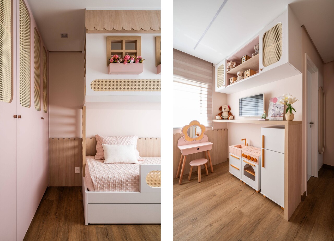 Já o quarto da menina traz um clima lúdico e encantador. A cama em formato de casinha, com aplicação de palhinha natural, é o grande destaque do ambiente, que combina tons de rosa e madeira clara. A penteadeira em formato de flor e a mini cozinha planejada estimulam a imaginação e o faz de conta. “Quisemos criar um espaço onde a criança pudesse brincar, crescer e se sentir abraçada”, afirma Érica.
