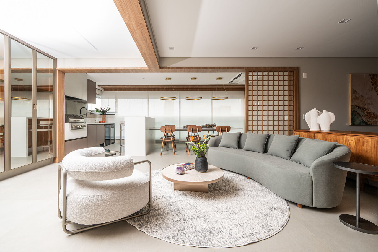 A proposta parte da integração total dos ambientes sociais, reunindo living, varanda gourmet, sala de jantar e cozinha em um único espaço fluido e visualmente leve. “Queríamos que tudo conversasse de forma natural. A ideia era trazer amplitude e, ao mesmo tempo, preservar o aconchego de uma casa que reflete a rotina e as preferências da moradora”, explica a arquiteta.