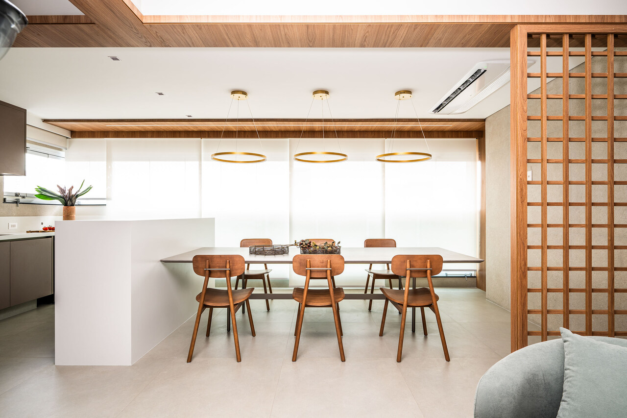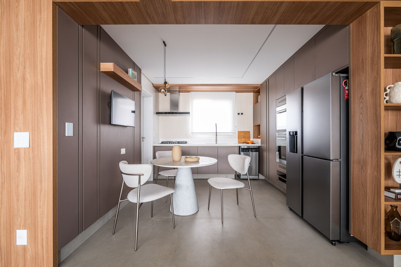Na cozinha, o tom gianduia imprime sofisticação à linguagem minimalista e funcional. O espaço se estende até uma charmosa mesa para refeições rápidas com três lugares. “Todos os acabamentos e mobiliários foram pensados com muito cuidado, inclusive para atender à gatinha da cliente. Optamos por tecidos duráveis e superfícies resistentes, sem abrir mão da sofisticação”, comenta Érica.