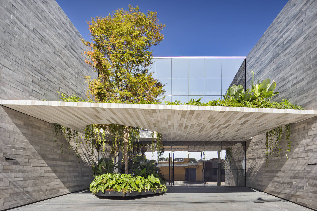 A fachada destaca-se pela harmoniosa conexão entre elementos lineares e árvores suspensas. Fatias de concreto emergem do solo apontando para o céu, enquanto uma ilha poligonal exuberante parece flutuar, dominando o espaço e acolhendo os visitantes. O projeto revela uma arquitetura em dois atos distintos, em ruas diferentes, mas intrinsecamente ligadas.