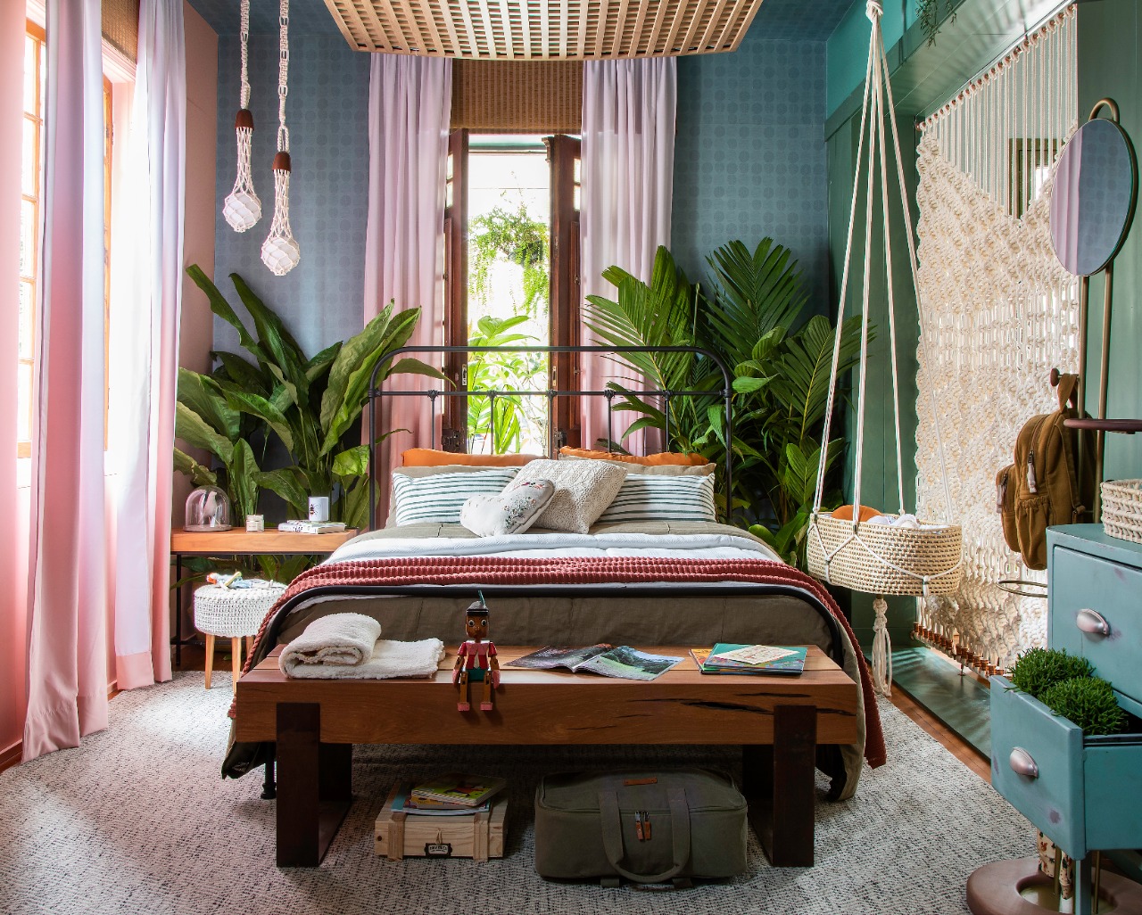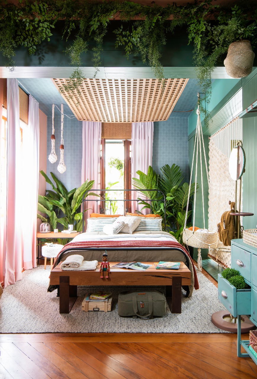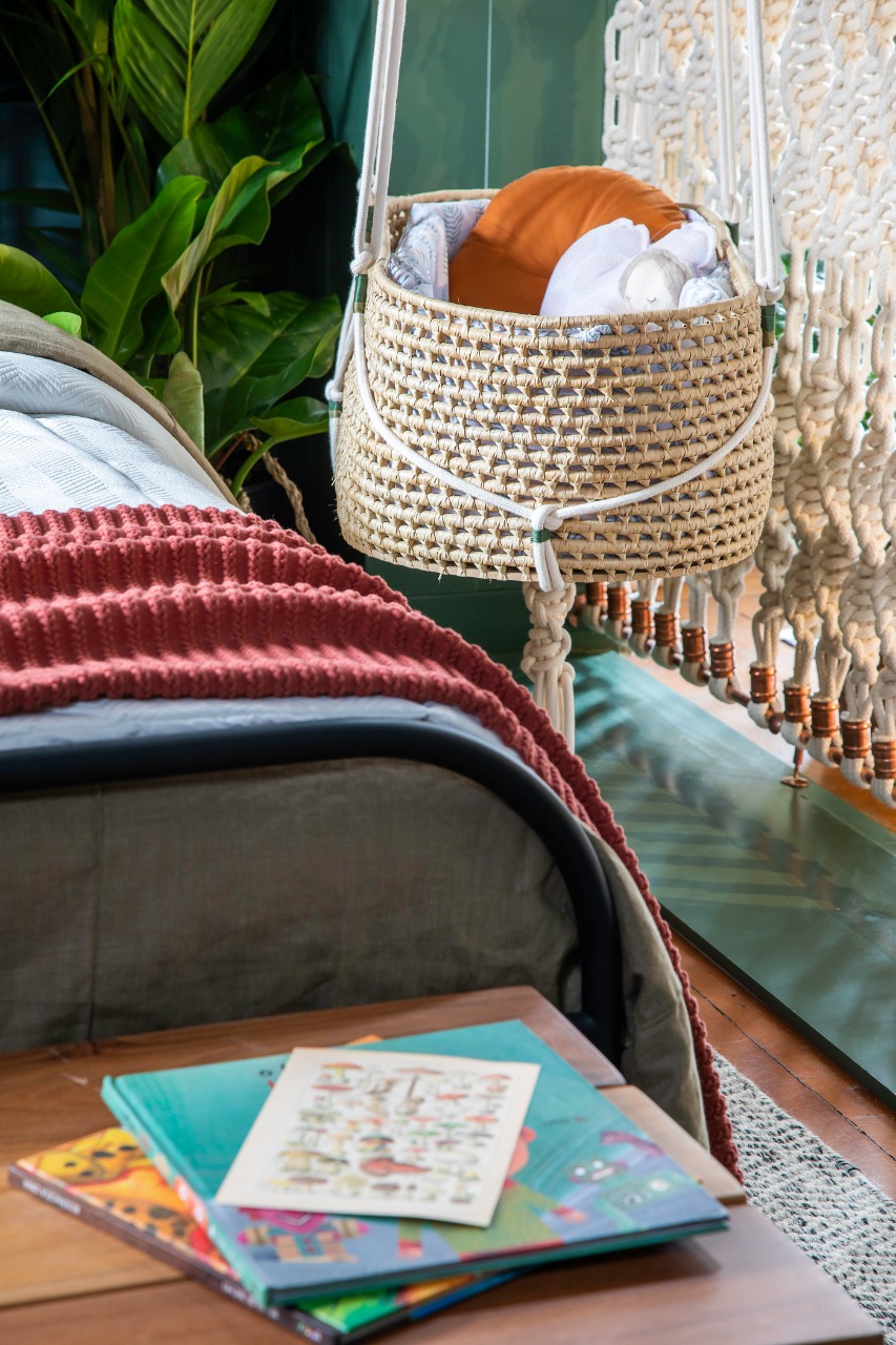 Outro destaque é o recinto elaborado para o filho maior com o Futton, roupa de cama da Beterraba e painel de atividades assinado por Carol Eleutério com um céu rosado, portinhas secretas, texturas e sons para a criança brincar, descobrir e explorar. “Para que o nenê possa dormir próximo a mãe criamos um bercinho suspenso ao lado da cama para facilitar a dinâmica da família. E pensando no filho maior, criamos um espaço exclusivo para ele dentro do quarto dos pais, de forma que ele se sinta incluído na nova rotina da família.”, revela Beatriz.