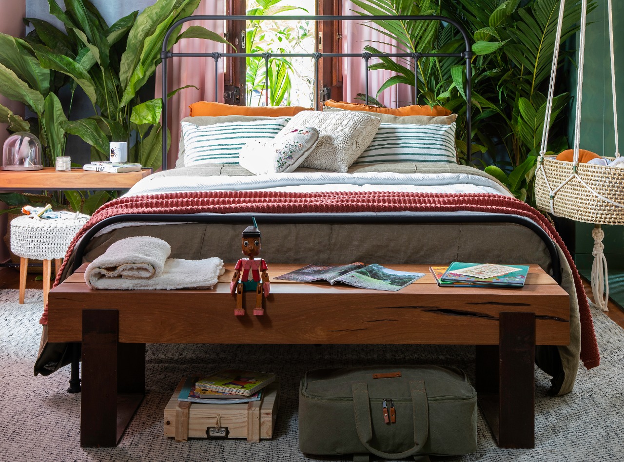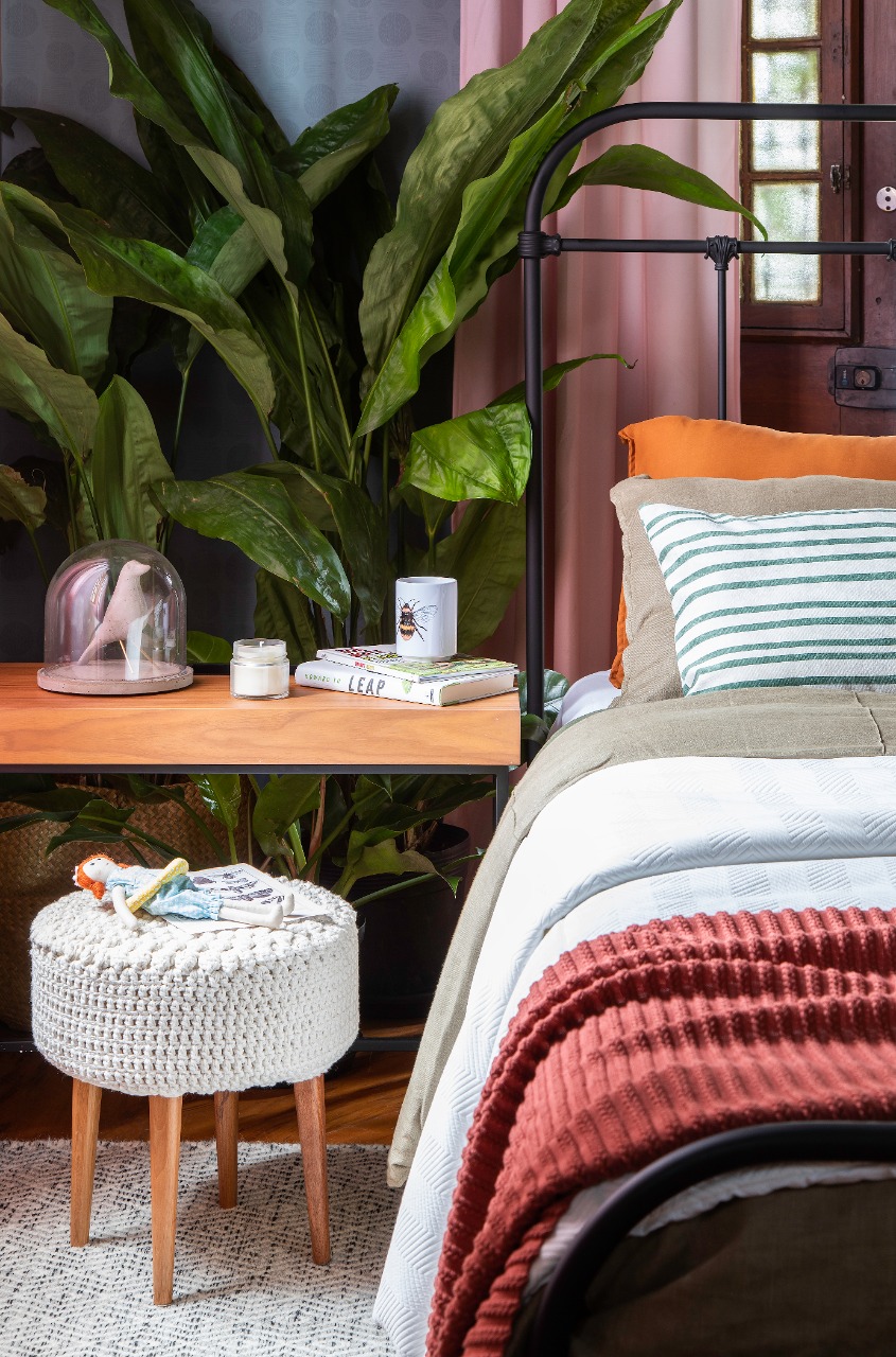 Os lambris da Santa Luzia e a cama de ferro da L’oiel, trazem um visual clássico revisitado, que combina bem com a roupa de cama contemporânea elaborada pelo Studio Nara Maitre, que, por sua vez, foi cuidadosamente escolhida visando o conforto e a beleza. O papel de parede criado exclusivamente para este projeto, acrescenta personalidade e estilo ao espaço. O banco de madeira maciça da Madeira de Lei, aliado ao paisagismo se integram organicamente com o loft através da vegetação que demarcam a área da varanda e trazem o estilo “Urban Jungle” para o espaço. “Tínhamos uma preocupação em não deixar a decoração muito básica, por isso a mistura de elementos naturais com mobiliário sofisticado foi essencial para que houvesse o equilíbrio na medida certa. Queríamos apresentar uma decoração afetiva, que ao entrarem no ambiente, os visitantes pudessem sentir o acolhimento do espaço, como se elas próprias morassem ali.”, comenta a arquiteta.