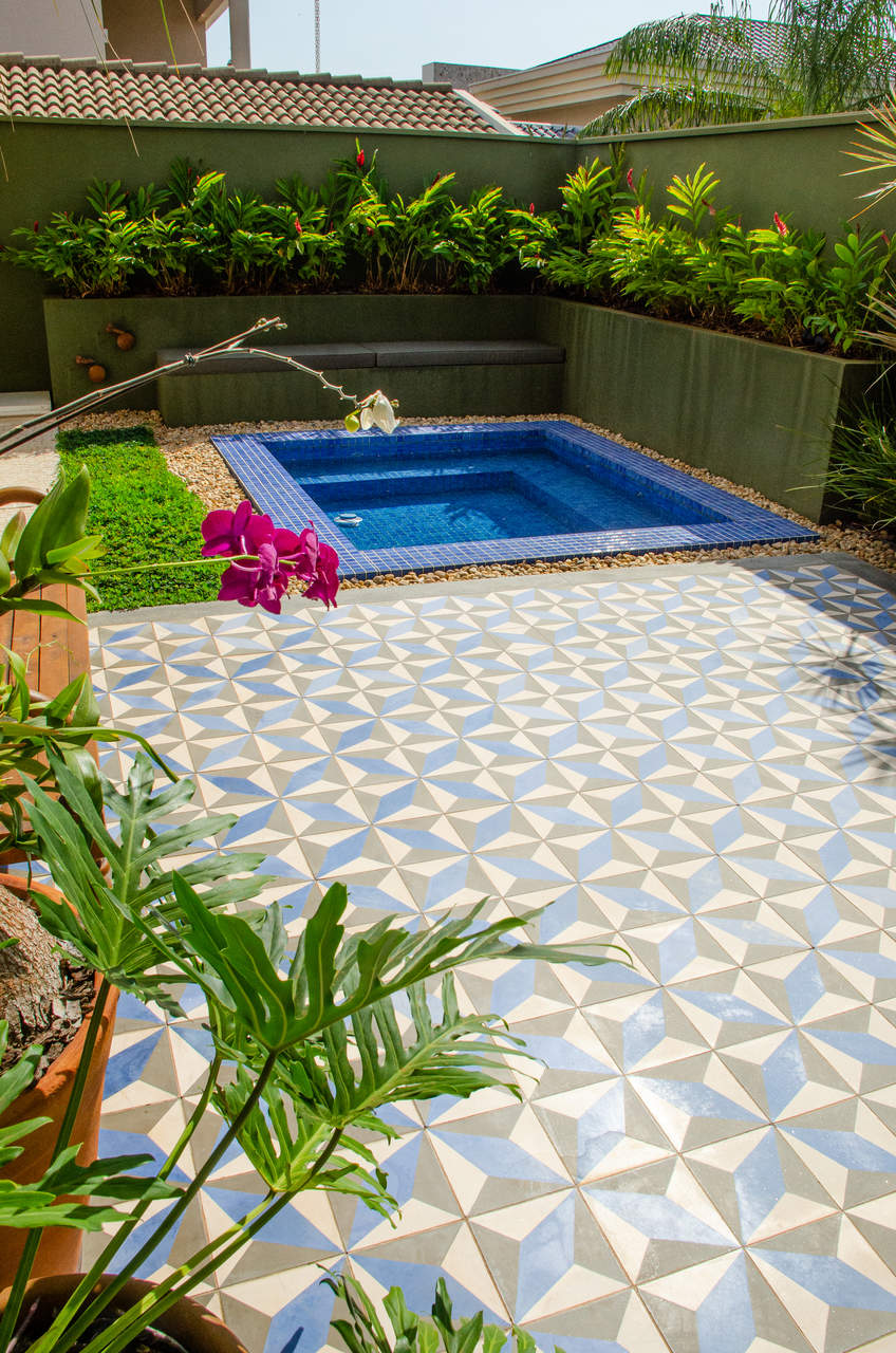 O ladrilho colorido que as arquitetas selecionaram para complementar a piscina dá um toque especial, fugindo da monotonia. A ideia foi criar um tapete nesta área, onde o cliente pode usar mesas, espreguiçadeiras e cadeiras.