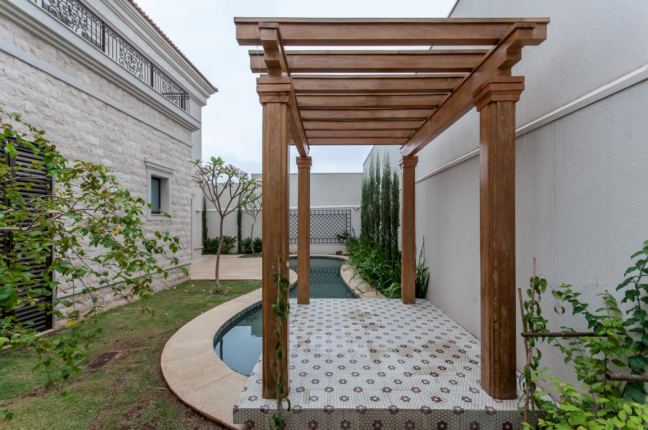 A piscina desta residência passou por reformas com o Paiva e Passarini e ganhou uma composição de ladrilhos com desenho em colmeia, muito comum nas clássicas casas da França, Inglaterra e Europa.