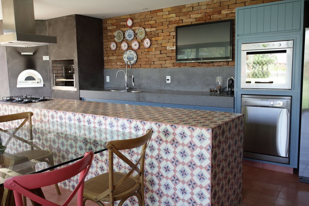 O revestimento ajuda a compor o ambiente bucólico, com toque retrô, e combina perfeitamente com os elementos naturais encontrados neste espaço, caso da madeira da estrutura do pergolado e dos tijolinhos aparentes da construção principal.