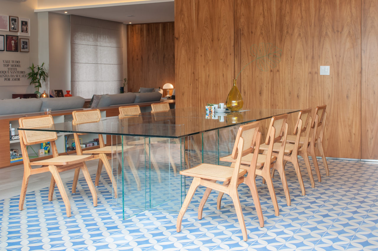 A mesa de vidro realça a estética atemporal, trazendo leveza ao cômodo. Ao mesmo tempo que a transparência destaca a estampa do ladrilho, evita que o decór fique sobrecarregado. Além disso, a escolha favorece a harmonia com o restante do projeto, que possui um ar de modernidade e inovação.