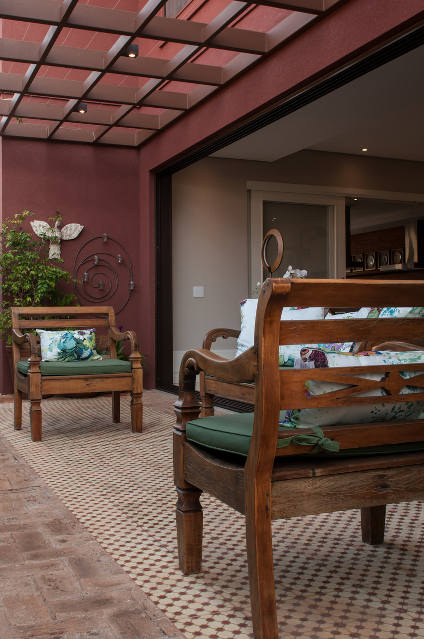 “Neste projeto, nosso objetivo era reforçar um estilo rústico e criar um lugar bem aconchegante, com referências afetivas. Por isso, optamos pela mistura do tijolo de demolição e do ladrilho com a estampa ‘casinha de abelha’, que remete às construções antigas”, conta Claudia sobre a reforma dessa varanda.