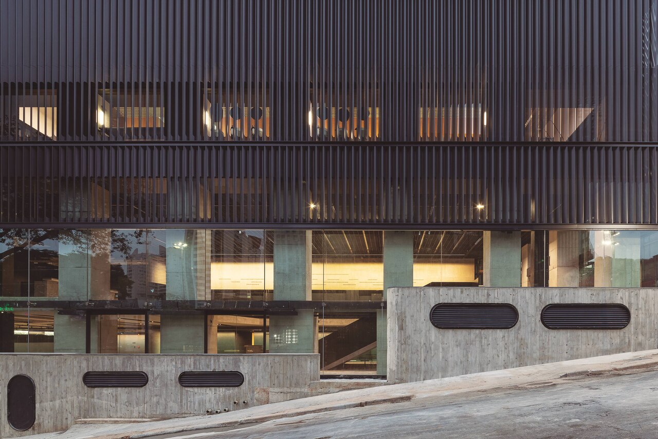 Fachada lateral do edifício Pietro Maria Bardi. A pele metálica reveste o edifício até certa altura, enquanto o térreo é envolto em vidro transparente, preserva a sensação de abertura e integração com o entorno