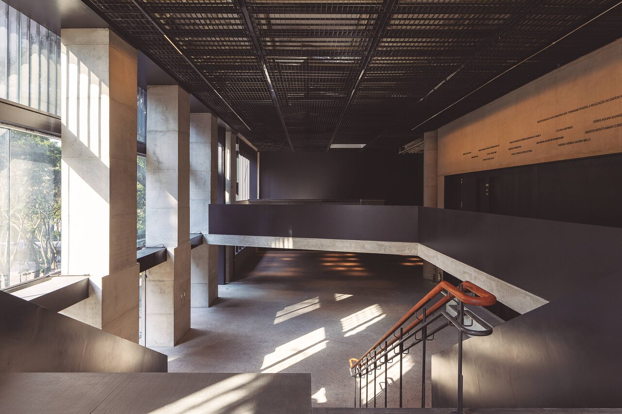 A presença marcante do concreto armado e os detalhes em preto na entrada do anexo estabelecem um diálogo harmonioso com o edíficio Lina Bo Bardi