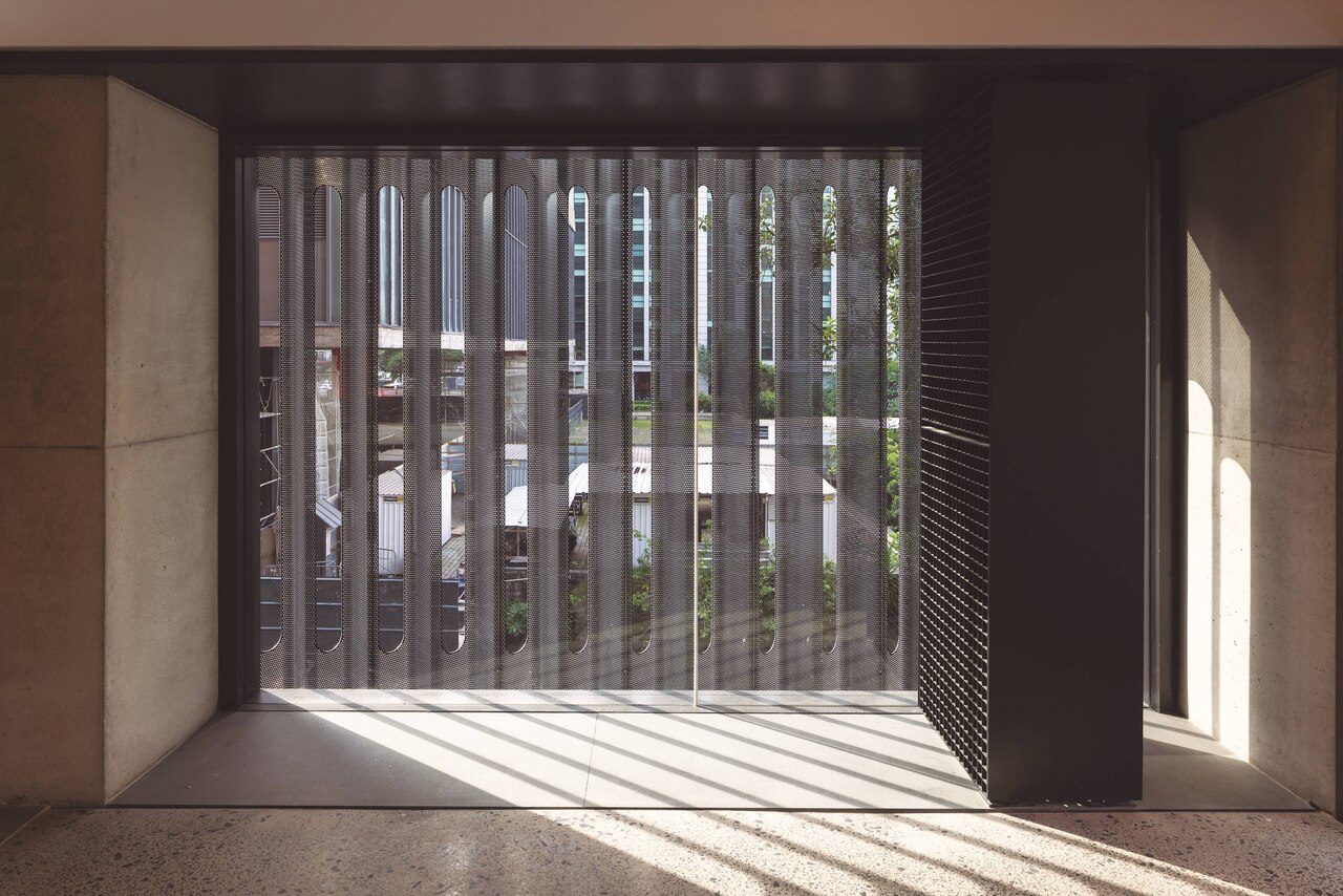 O revestimento externo em chapas metálicas perfuradas e plissadas controla a luz natural e reduz o aquecimento interno, funcionando