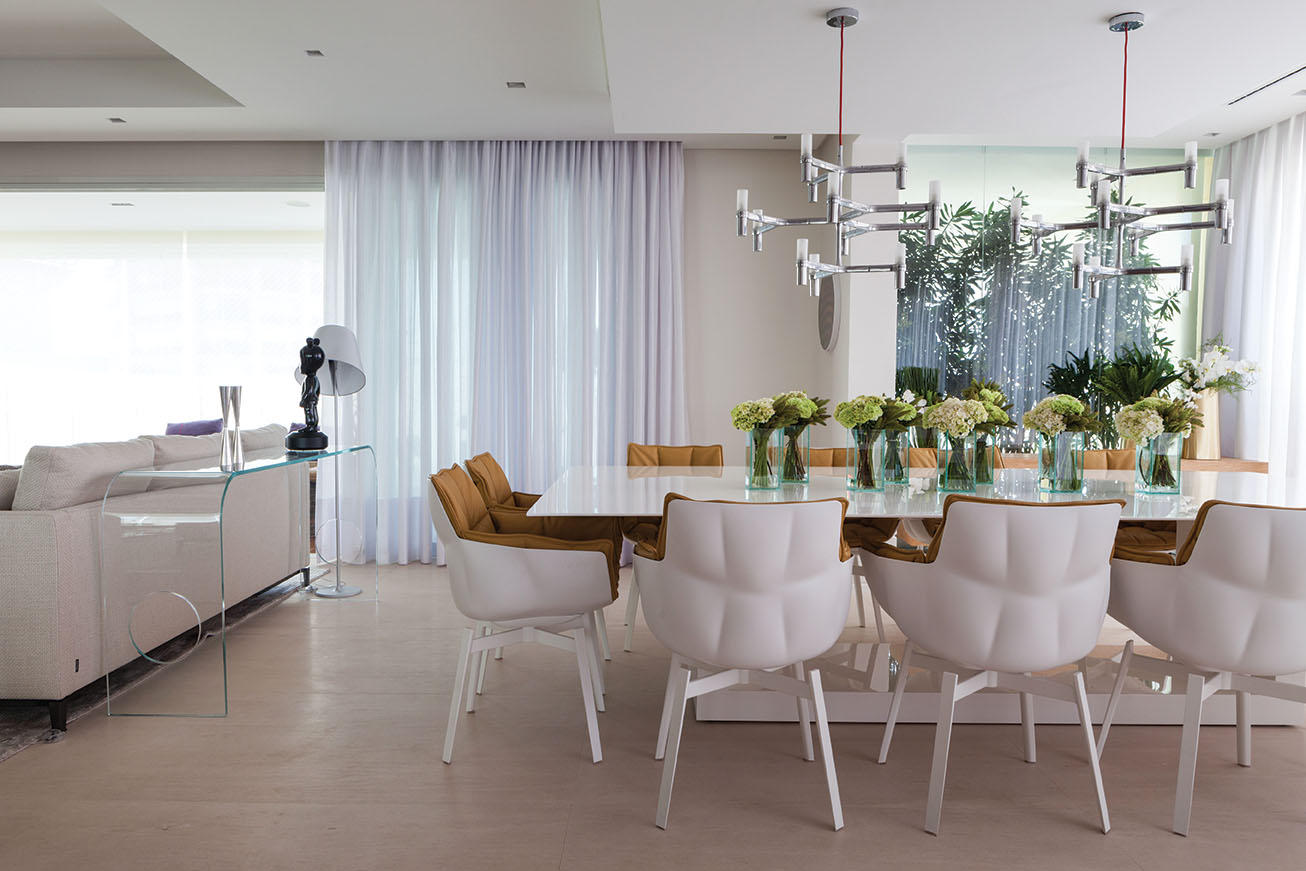 A madeira é predominante na sala de jantar, que recebeu um painel iluminado de freijó dourado. Na mesma linguagem, a mesa de nogueira, da Artzzi, tem pé central e faz parceria com cadeiras revestidas de suede. Para trazer o ar clássico, o pendente é de cristal âmbar, de Maria Pia Casa.