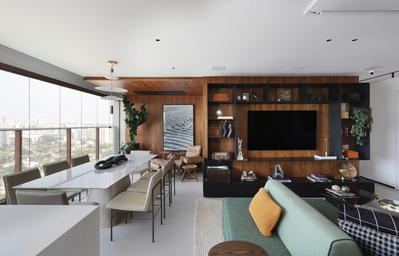 Em uma mistura equilibrada de tons claros e escuros, Dudi optou por integrar toda a área social, que inclui sala de estar, jantar, varanda gourmet e cozinha. “Meu objetivo foi favorecer a interação entre as pessoas, para que elas conversem e estejam sempre juntas”, explica. Com o projeto que propôs a ausência de paredes e divisões rígidas, a vista do bairro se abriu totalmente para as salas e a cozinha. O piso contínuo de porcelanato e o moodboard sereno contribuíram para a sensação de amplitude.