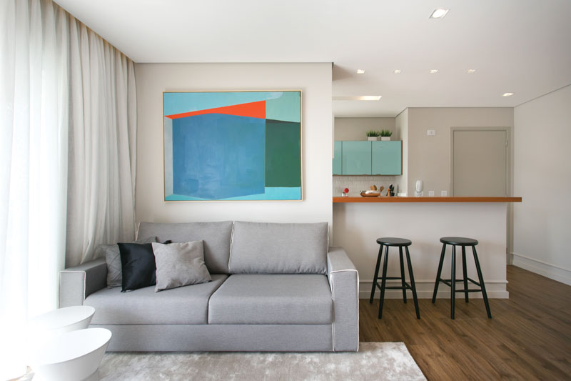 Limpo e funcional, o design de interiores tem um quê escandinavo. Sobre as cores neutras adotadas na base do projeto, que conferem a sensação de aconchego, Laila brincou com tons de azul que alegram os ambientes com sobriedade e elegância. O apartamento todo recebeu revestimento vinílico no piso em padrão amadeirado, em contrapartida da madeira natural, por causa da praticidade e por exigir pouca manutenção. Para as cortinas, a escolha recaiu para o linho por ser encorpado, dar leveza e promover transparência ao ambiente.