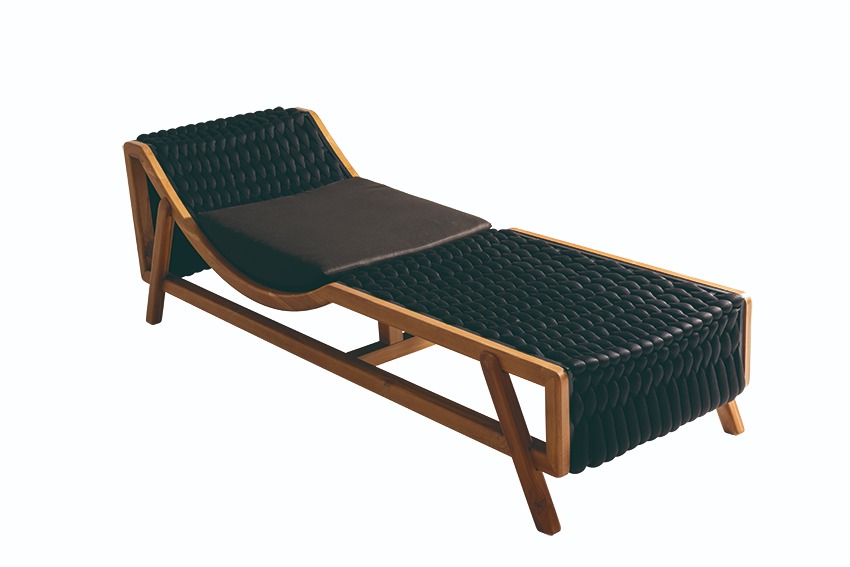 A Chaise Flag Outdoor, composta por madeira de teca e tricot náutico, é multifuncional, pode ser utilizada como recamier para sentar ou como chaise long para deitar.
