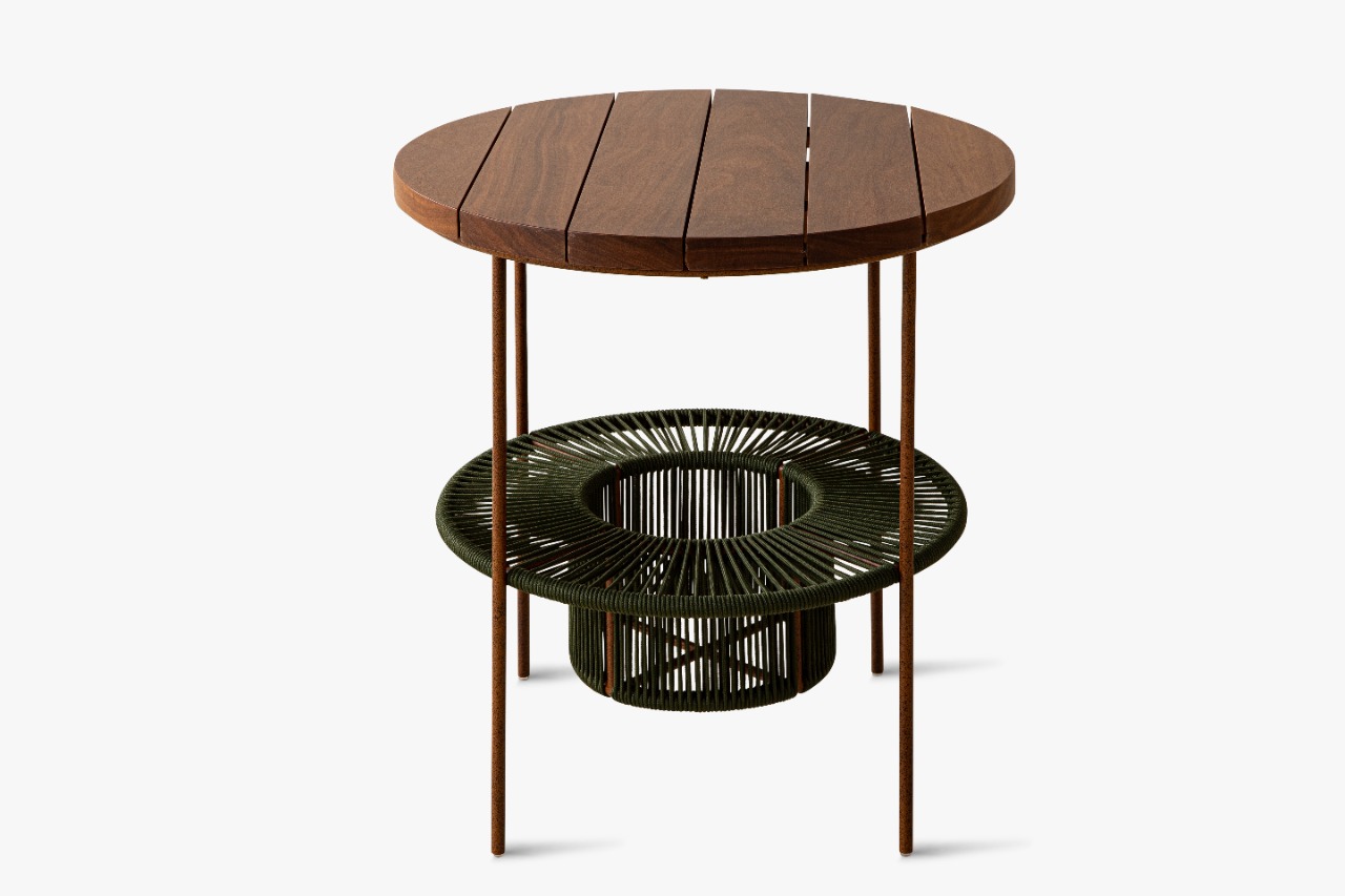 A mesa lateral Boipeba tem sua estrutura em aço inox com pintura corten, tampo ripado em madeira cumaru e detalhe em corda nautica verde.