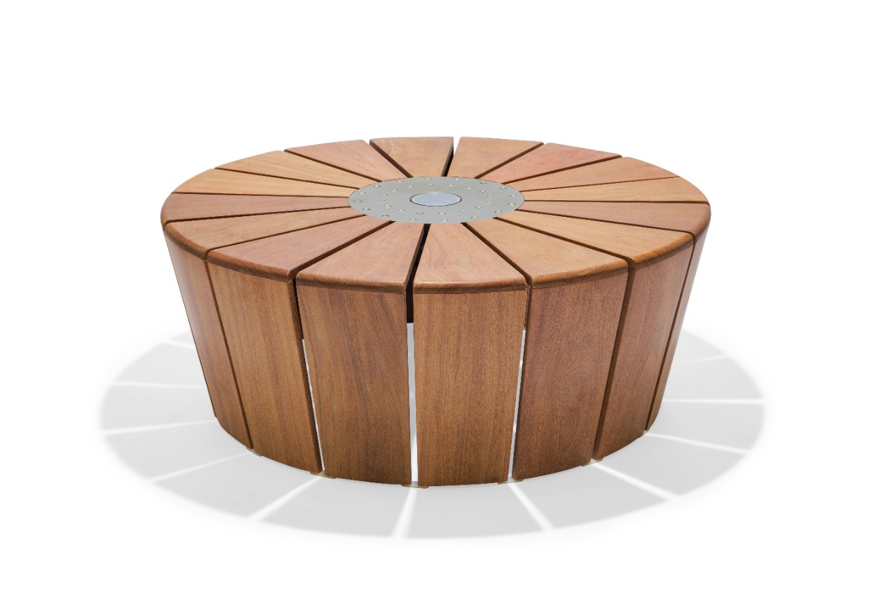 O designer Marcelo Bicudo assina o banco Íris, inspirado no olho humano. A peça, redonda e de concepção estrutural peculiar, tem efeito de iluminação proveniente de dispositivo central regulável, alimentado por energia solar.