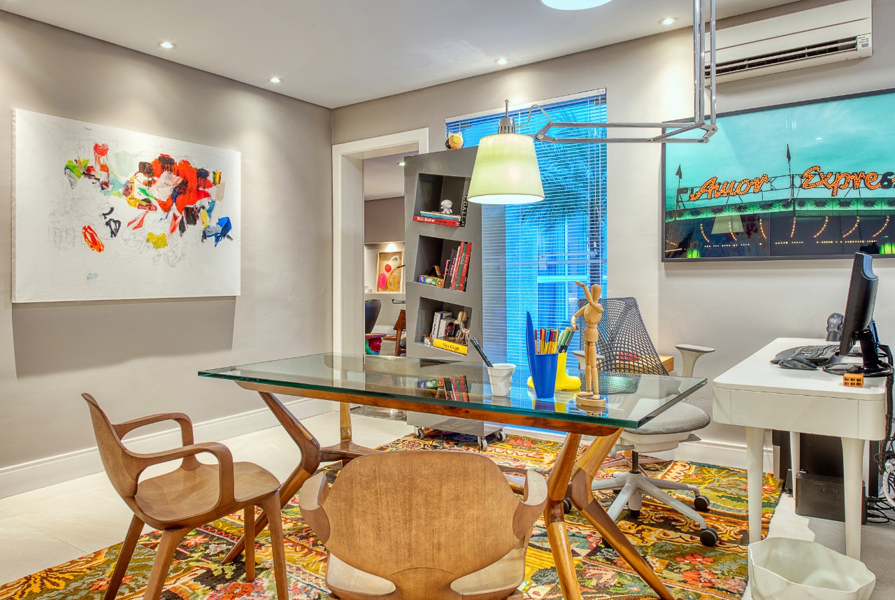 No mobiliário, a arquiteta trouxe uma mistura de elementos para compor o escritório. Mesas com tampo de vidro aumentam a visibilidade do espaço, A escolha da madeira como acabamento aquece o ambiente. Elemento marcante no projeto, as peças assinadas por Jader Almeida, que garantem um ar mais robusto ao espaço.