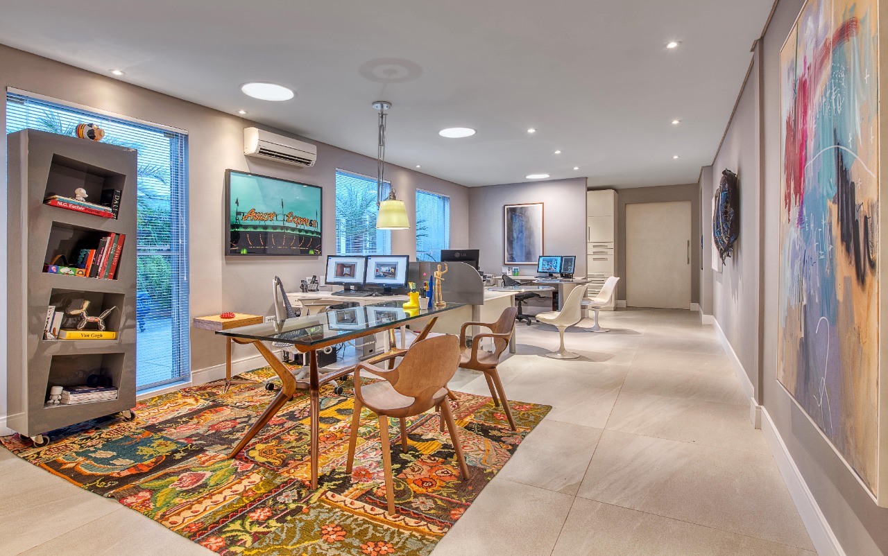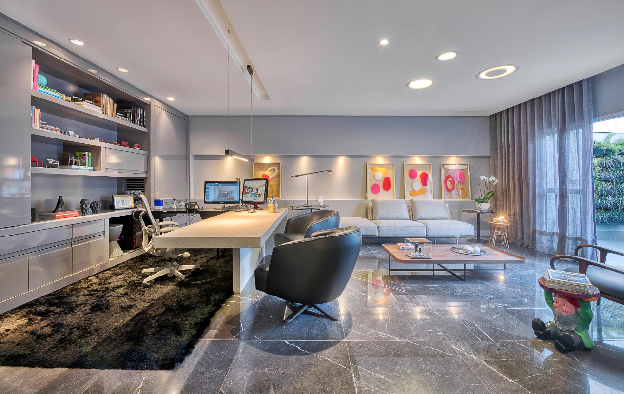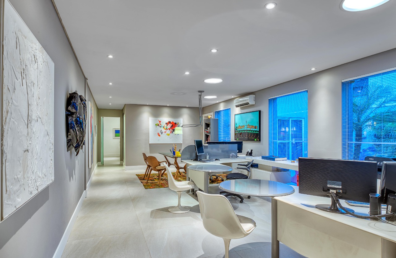 Daniela Barranco é uma estudiosa da neuroarquitetura, conceito que busca entender como os ambientes podem impactar o cérebro e como trazer elementos que proporcionem diferentes sensações através do décor. Para esse projeto corporativo, a arquiteta decidiu integrar os espaços ao jardim de inverno do imóvel, proporcionando maior incidência de luz natural e verde para dentro dos ambientes por meio de grandes janelas.