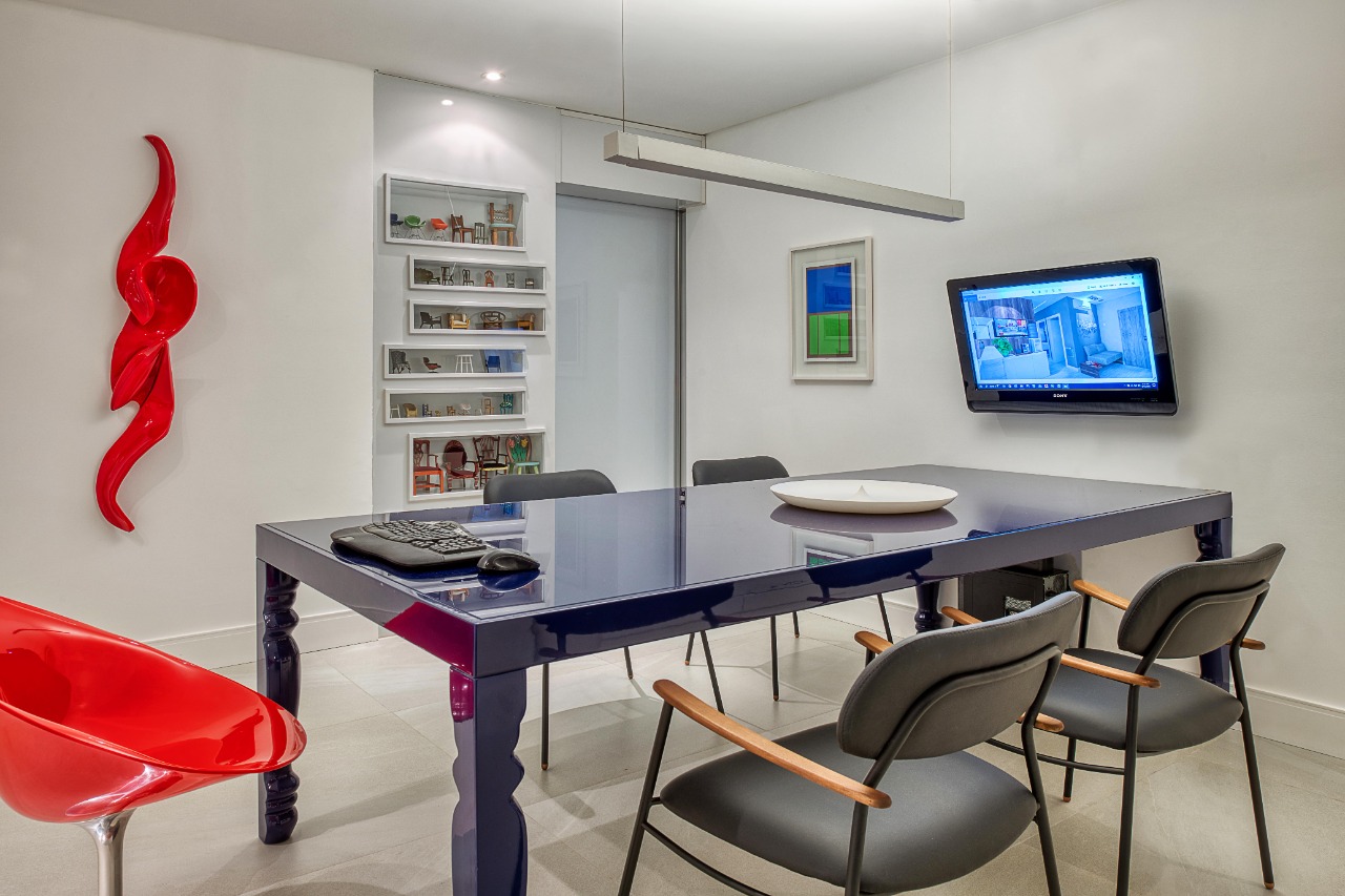 A paleta mais sóbria, composta por tons neutros, ganha pontos de cor nas obras de arte e peças de mobiliário, como a mesa azul de silestone na sala de reunião. A utilização das cores de forma estratégica permite trazer uma sensação mais descontraída e criativa ao espaço, melhorando o ambiente de convívio dos colaboradores. Já na marcenaria, como a grande estante da sala principal, a profissional apostou na mesma cor das paredes, trazendo um toque mais minimalista e discreto.