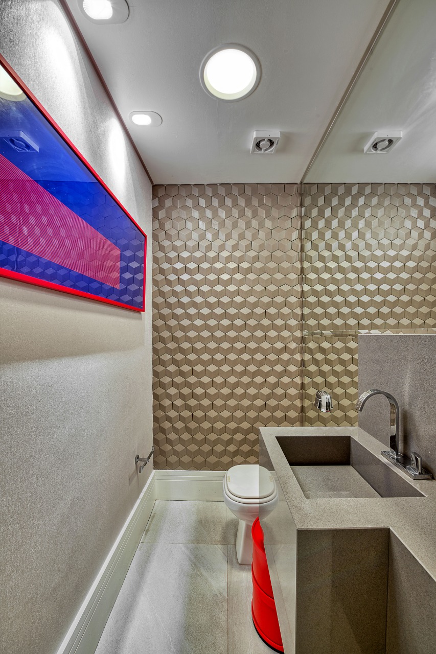 A sofisticação fica por conta dos acabamentos de alto padrão, como o piso em mármore Gris Armani na sala principal e na bancada do lavabo – que segue o mesmo padrão de acabamentos em cinza, ganhando uma parede com formas tridimensionais e pontos de cor vermelha nos elementos de decoração.