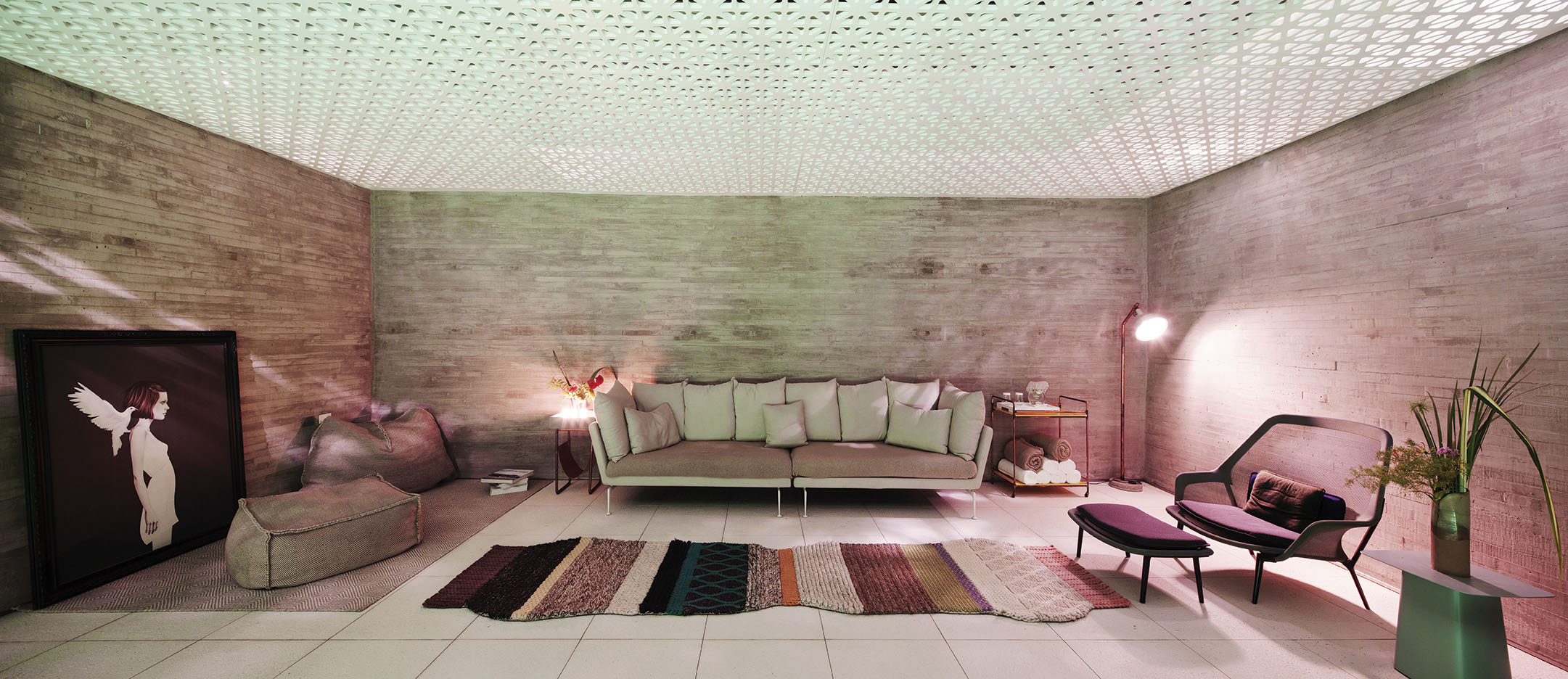 O Lounge Relax, maior sala do SPA, possui paredes de concreto ripado e cobertura feita por uma pérgola de muxarabi, treliça tradicionalmente feita em madeira, utilizada em palácios árabes. Ali, destaque para o tapete Gan, da designer espanhola Patricia Urquiola, e sofá Suita, com desenho de Antonio Citterio que combina volumes leves e estética industrial.