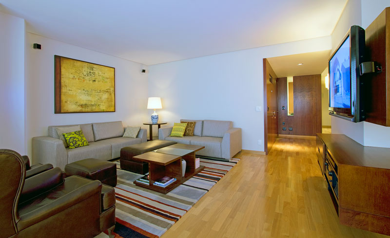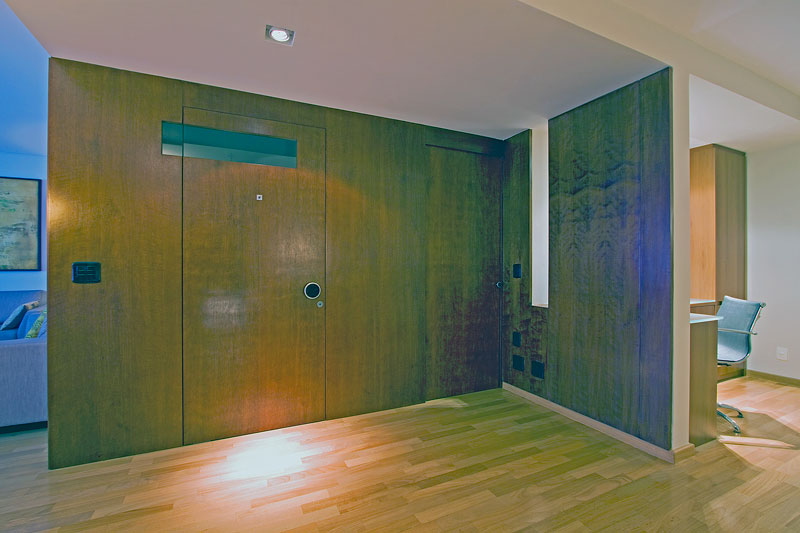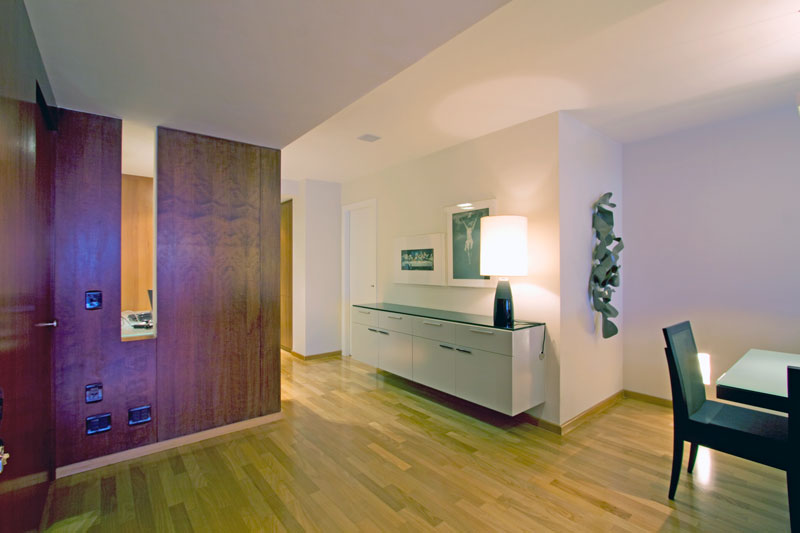 O casal de jovens senhores que viaja todo o fim de semana para o campo adquiriu um imóvel novo no Tatuapé e desejava que apresentasse um estilo urbano e que fosse funcional. O designer de interiores Walter Fagundes recorreu à marcenaria (Index Brasil) para atender aos desejos dos clientes. Um dos primeiros destaques do projeto é a entrada que graças aos painéis de madeira formam duas empenas em L, mimetizando as portas sociais e da cozinha e contrastando com o piso mais claro. O recorte horizontal faz um jogo gráfico com a abertura lateral vertical.