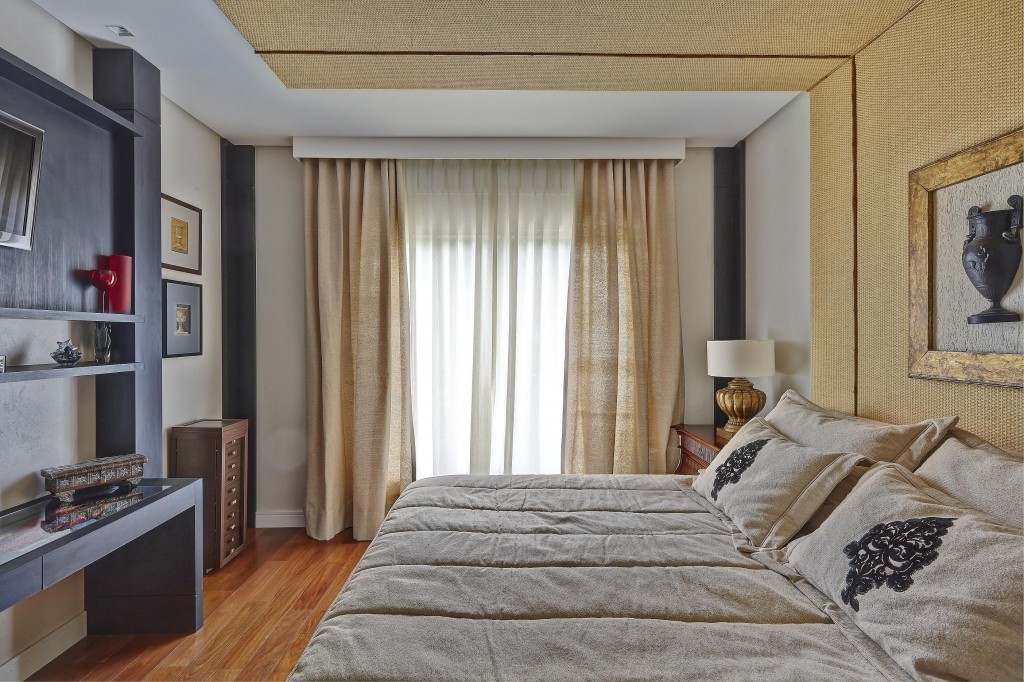 O dormitório do casal segue o mesmo conceito de estilo clássico contemporâneo. Sóbrio, o cômodo recebeu mobiliário desenhado pela arquiteta, executado em MDF com acabamento melamínico padrão ebanizado.