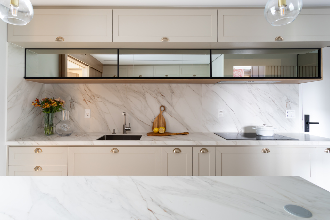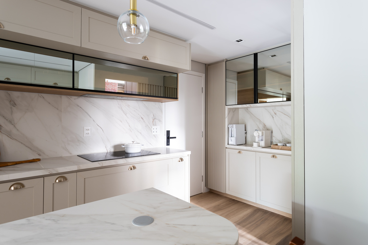 A cozinha é integrada quando as portas mimetizadas e de correr são abertas, oferecendo a possibilidade de escolha para a família. “Desenhamos muitos armários para que os moradores pudessem dispor todos os utensílios e itens da despensa com comodidade, além de inserirmos uma ilha durante a reforma”, explica Mari sobre as mudanças inseridas no cômodo que antes era totalmente integrado com a área social.